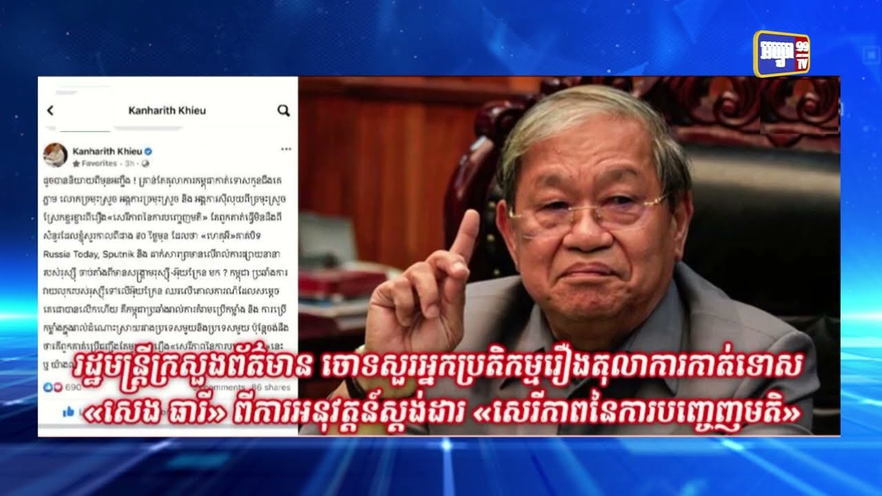 រដ្ឋមន្ត្រីក្រសួងព័ត៌មាន ចោទសួរអ្នកប្រតិកម្មរឿងតុលាការកាត់ទោស «សេង ធារី» ពីការអនុវត្តន៍ស្តង់ដារ «សេរីភាពនៃការបញ្ចេញមតិ» (Video Inside)កម្មវិធីព័ត៌មានទូរទស្សន៍ព្រឹត្តិការណ៍ប្រចាំថ្ងៃអត្ថបទដោយ៖ឆាយ រត្ថា ឆាយ រត្ថាលោក ឆាយ រត្ថា ជាបុគ្គលិកផ្នែកព័ត៌មានវិទ្យា នៃអគ្គនាយកដ្ឋានវិទ្យុ និងទូរទស្សន៍ អប្សរាអត្ថបទមុនអត្ថបទបន្ទាប់