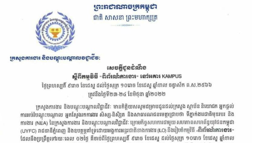 ក្រសួងការងារបានបញ្ជាក់ដល់ក្រសួង ស្ថាប័ន និយោជក អ្នកផ្តល់ ការអប់រំ បណ្ដុះបណ្តាល អ្នកស្វែងរកការងារ សិស្ស-និសិ្សត និង សាធារណជនឱ្យជ្រាបថា ទីភ្នាក់ងារជាតិមុខរបរ និង ការងារ (NEA) នៃក្រសួងការងារ និងបណ្តុះបណ្តាលវិជ្ជាជីវៈ ក្រោមកិច្ចសហការជាមួយ សហភាពសហព័ន្ធយុវជនកម្ពុជា (UYFC) រាជធានីភ្នំពេញ និងឧបត្ថម្ភ គាំទ្រដោយអង្គការអន្តរជាតិខាងការងារ (ILO) នឹងរៀបចំកម្មវិធី «ពិព័រណ៍ការងារ ” ដែលនឹងប្រព្រឹត្តទៅរយៈពេលពីរថ្ងៃ គឺចាប់ពី ថ្ងៃទី២៣-២៤ ខែមិថុនា ឆ្នាំ២០២២ វេលាម៉ោង ៨ព្រឹក ដល់ម៉ោង ១៧ ល្ងាច នៅទីតាំងអគារ Kampus ជិតស្ពានអាកាសក្បាលថ្នល់ ។