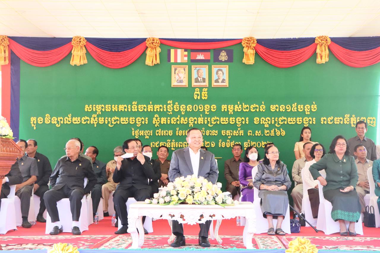 ភ្នំពេញ ៖ អគាររដ្ឋបាលថ្មីចំនួនមួយខ្នង កម្ពស់ពីរជាន់ មាន១៥បន្ទប់ ស្ថិតនៅក្នុងវិទ្យាល័យ ជា ស៊ីម ជ្រោយចង្វារ សង្កាត់ជ្រោយចង្វារ ខណ្ឌជ្រោយចង្វារ រាជធានីភ្នំពេញ ត្រូវបានរៀបចំពិធីសម្ភោធ ដាក់ឱ្យ ប្រើប្រាស់ ក្រោមអធិបតីភាពដ៏ខ្ពង់ខ្ពស់របស់សម្តេច វិបុល សេនាភក្តី សាយ ឈុំ ប្រធានព្រឹទ្ធសភា នៃព្រះរាជាណាចក្រកម្ពុជា នាព្រឹកថ្ងៃ ទី២១ ខែមិថុនា ឆ្នាំ២០២២។