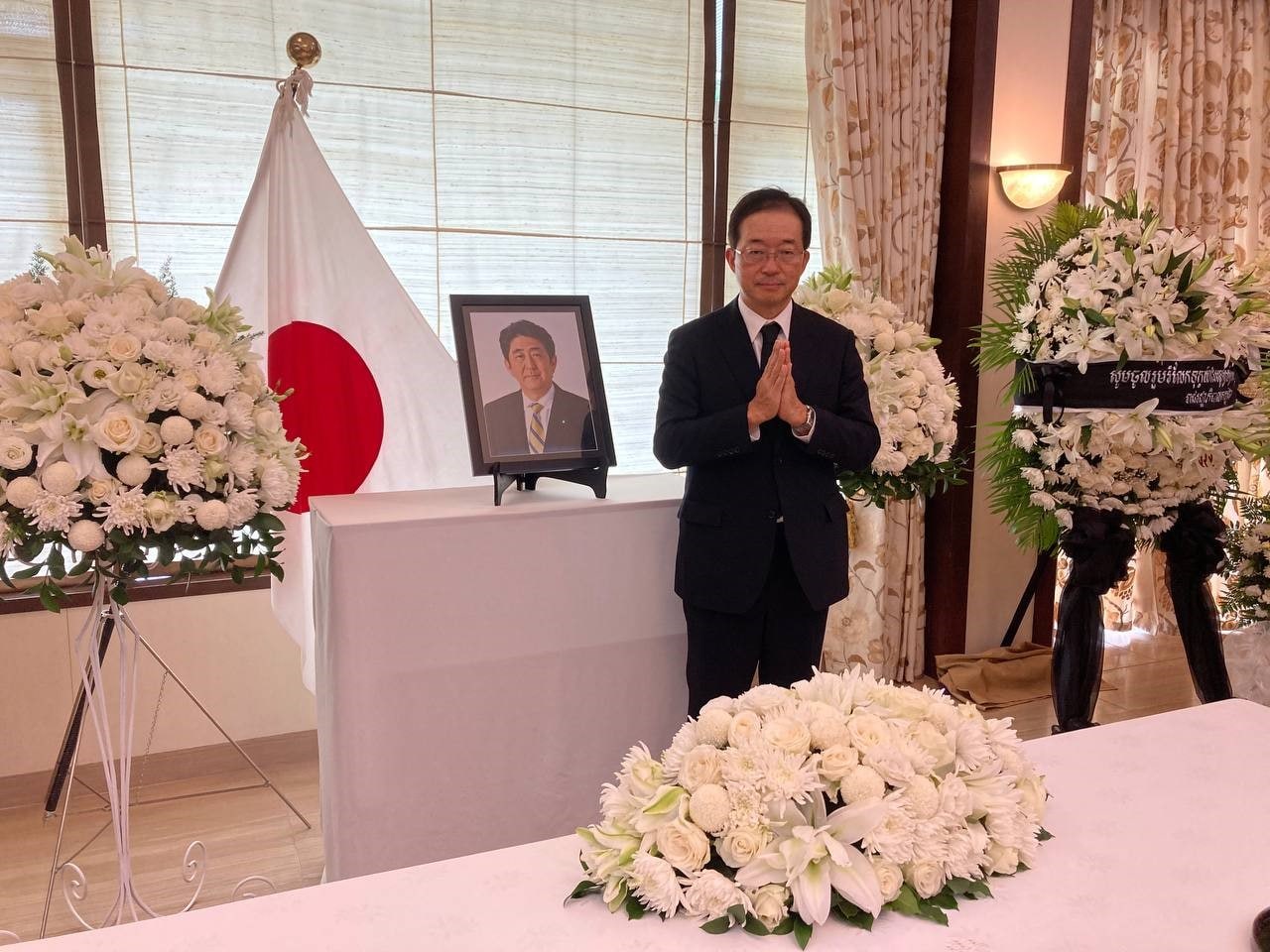 ស្ថានទូតជប៉ុនក៏បានថ្លែងអំណរគុណដោយស្មោះអស់ពីដួងចិត្ត ចំពោះទឹកចិត្ត និងកាយវិការដ៏កក់ក្តៅដល់ប្រទេស និងប្រជាជនជប៉ុនក្នុងខណៈពេលដ៏លំបាកនេះ។ យើងខ្ញុំទទួលបាននូវការរំលឹកអំពីចំណងមិត្តភាពដ៏រឹងមាំរវាងកម្ពុជា និងជប៉ុនសាជាថ្មីម្តងទៀត។ជាក់ស្តែង អតីតនាយករដ្ឋមន្រ្តី អាបេ បានបម្រើការងារជានាយករដ្ឋមន្រ្តី ២អាណត្តិ ហើយឯកឧត្តមបានត្រួសត្រាយផ្លូវក្នុងការពង្រឹងទំនាក់ទំនងរវាងរវាងកម្ពុជា និងជប៉ុនតាមរយៈ កិច្ចប្រជុំកំពូល និងការបង្កើតគោលនយោបាយការបរទេសនានា។ នៅឆ្នាំ២០១៣ឯកឧត្តម បានធ្វើទស្សនកិច្ចផ្លូវការមកកាន់កម្ពុជា។ នាឆ្នាំដដែលនោះ ដែលជាខួបអនុស្សាវរីយ៍លើកទី៦០នៃទំនាក់ទំនងការទូតរវាងជប៉ុន និងកម្ពុជា សមេ្តចតេជោនាយករដ្ឋមន្រ្តី ហ៊ុន សែន ក៏បានធ្វើទស្សនកិច្ចទៅកាន់ប្រទេសជប៉ុន ពេលនោះ ឯកឧត្តម អាបេ និងសម្តេចតេជោ បានរួមគ្នាជម្រុញទំនាក់ទំនងទ្វេភាគីនេះ ឈានដល់ភាពជាដៃគូយុទ្ធសាស្រ្ត។