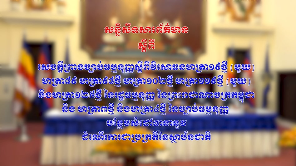 សន្និសីទសារព័ត៌មាន ស្តីពី សេចក្តីព្រាងច្បាប់ធម្មនុញ្ញស្តីពីវិសោធនមាត្រា១៩ថ្មី(មួយ) មាត្រា៨៩ មាត្រា៩៨ថ្មីមាត្រា១០២ថ្មី មាត្រា១១៩ថ្មី(មួយ) និងមាត្រា១២៥ថ្មី នៃរដ្ឋធម្មនុញ្ញ នៃព្រះរាជាណាចក្រកម្ពុជា និង មាត្រា៣ថ្មី និងមាត្រា៤ថ្មី នៃច្បាប់ធម្មនុញ្ញ បន្ថែមសំដៅធានានូវ ដំណើរការជាប្រក្រតី នៃស្ថាប័នជាតិ។