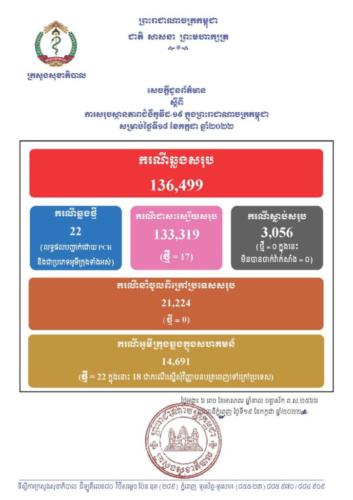 ៤. កូវីដ ករណីថ្មី ២២នាក់ ជាសះស្បើយ ១៧នាក់ និងគ្មានអ្នកស្លាប់។