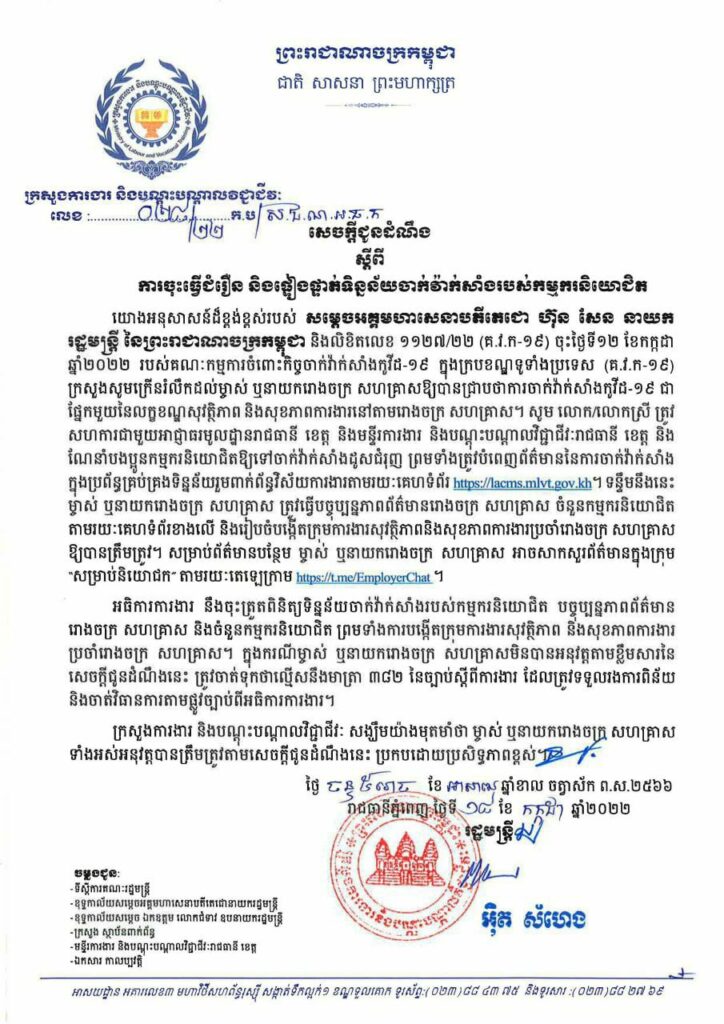 ក្នុងសេចក្តីជូនដំណឹងនៅថ្ងៃទី ១៩ ខែ កក្កដា ឆ្នាំ២០២២នេះ ក្រសួងការងារបានបញ្ជាក់ ដោយជំរុញឱ្យដល់ថ្នាក់គ្រងគ្រងរោងចក្រ សហគ្រាស សហការជាមួយអាជ្ញាធរមូលដ្ឋានរាជធានី ខេត្ត និងមន្ទីរការងារ និងបណ្តុះបណ្តាលវិជ្ជាជីវៈរាជធានី ខេត្ត និង ណែនាំបងប្អូនកម្មករនិយោជិតឱ្យទៅចាក់វ៉ាក់សាំងដូសជំរុញ ព្រមទាំងត្រូវបំពេញព័ត៌មាននៃការចាក់វ៉ាក់សាំង ក្នុងប្រព័ន្ធគ្រប់គ្រងទិន្នន័យរួមពាក់ព័ន្ធវិស័យការងារតាមរយៈគេហទំព័រ https://acms.mlvt.gov.kh។