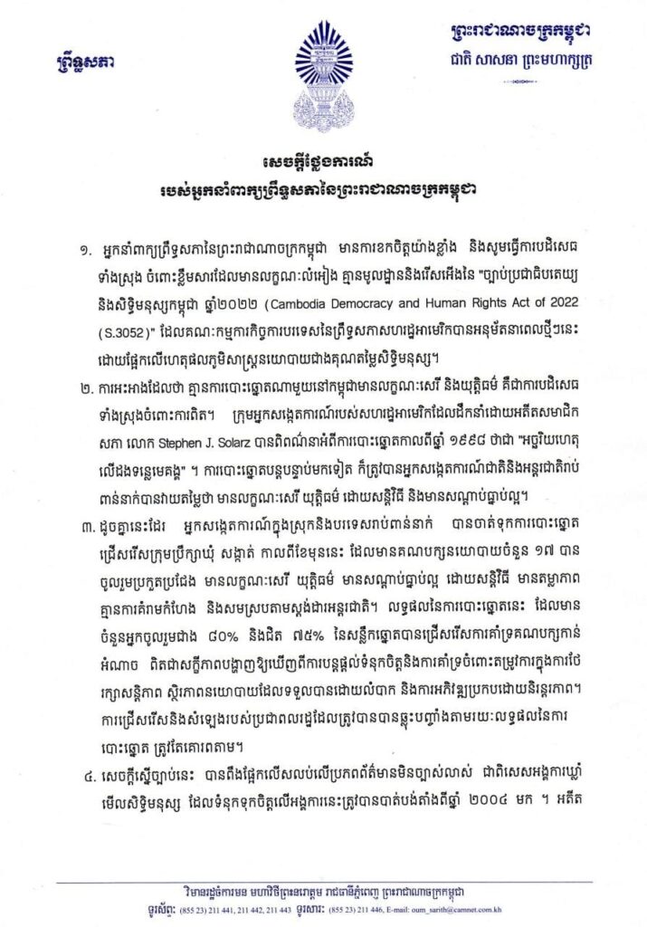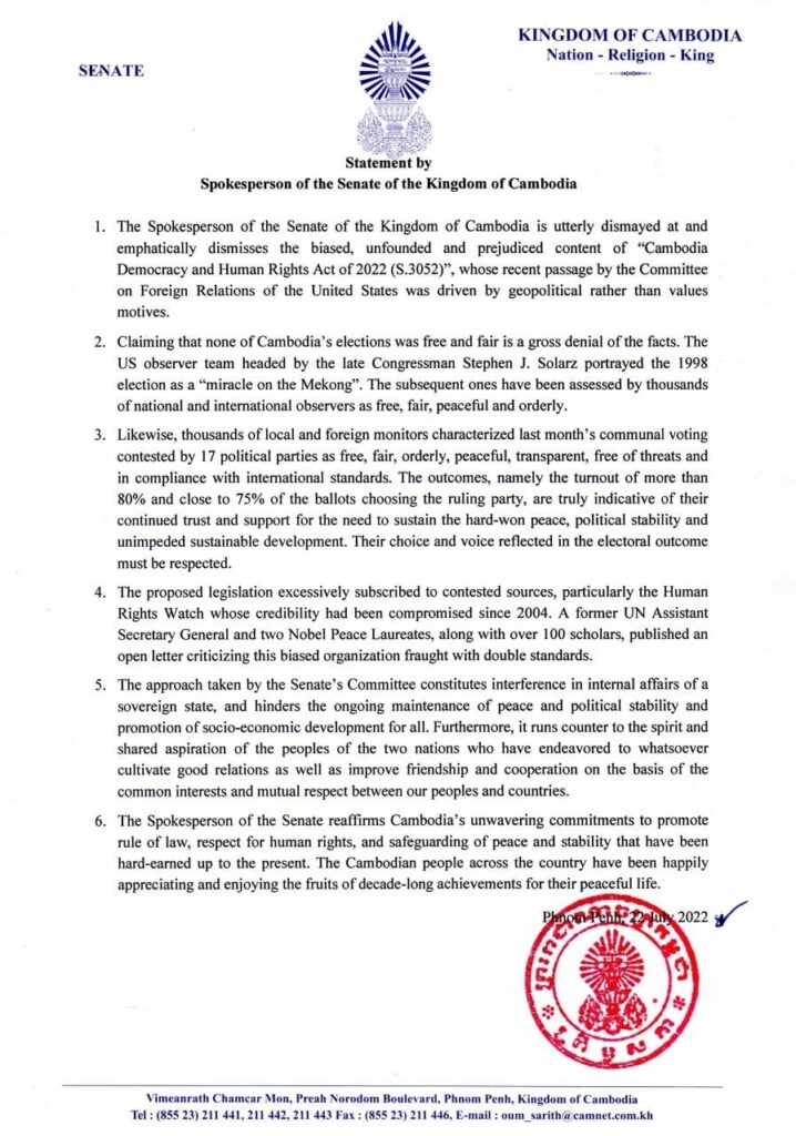 ភ្នំពេញ ៖ ព្រឹទ្ធសភាកម្ពុជា បានបដិសេធទាំងស្រុង ចំពោះខ្លឹមសារដែលមានលក្ខណៈលំអៀង គ្មានមូលដ្ឋាន និងរើសអើងនៃ «ច្បាប់ប្រជាធិបតេយ្យ និងសិទ្ធិមនុស្សកម្ពុជា ឆ្នាំ២០២២ (Cambodia Democracy and Human Rights Act of 2022 (S.3052)» ដែលគណៈកម្មការកិច្ចការបរទេសនៃព្រឹទ្ធសភាសហរដ្ឋអាមេរិក បានអនុម័តនាពេលថ្មីៗនេះ ដោយផ្អែកលើហេតុផលភូមិសាស្ត្រនយោបាយជាងគុណតម្លៃសិទ្ធិមនុស្ស។