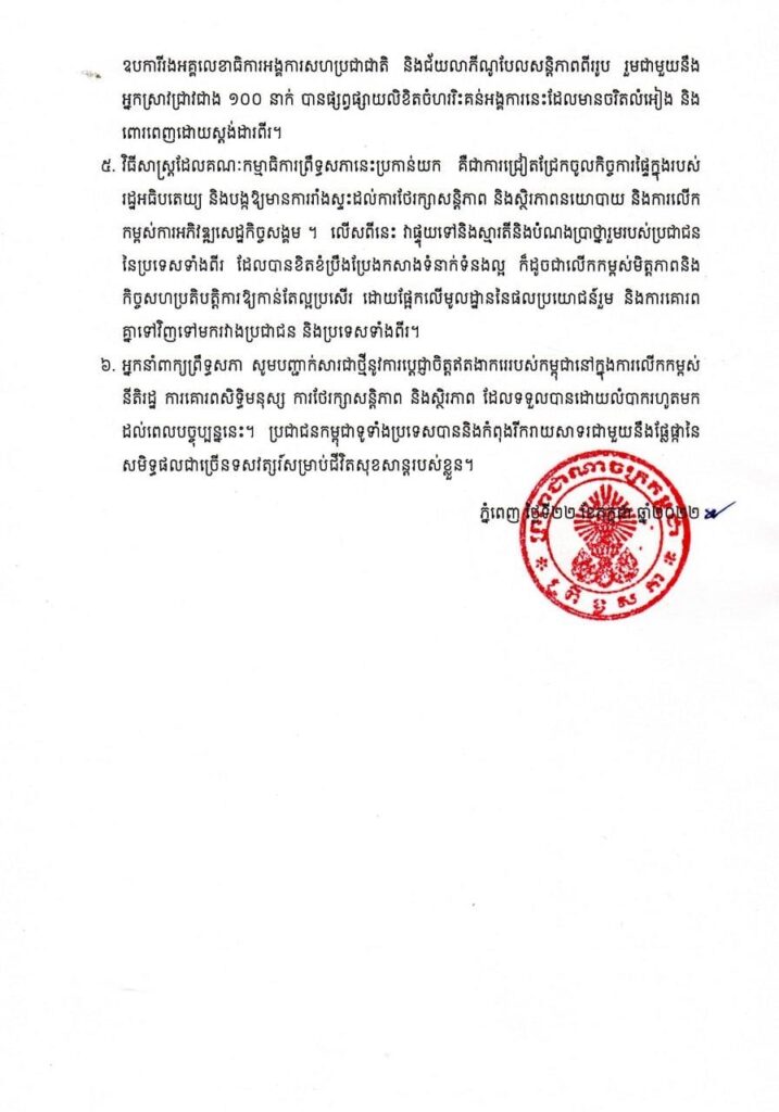 អ្នកនាំពាក្យព្រឹទ្ធសភា សូមបញ្ជាក់សារជាថ្មីនូវការបេ្តជ្ញាចិត្តឥតងាករេរបស់កម្ពុជានៅក្នុងការលើកកម្ពស់នីតិរដ្ឋ ការគោរពសិទ្ធិមនុស្ស ការថែរក្សាសន្តិភាព និងស្ថិរភាព ដែលទទួលបានដោយលំបាករហូតមកដល់ពេលបច្ចុប្បន្ននេះ។ ប្រជាជនកម្ពុជាទូទាំងប្រទេសបាននិងកំពុងរីករាយសាទរ ជាមួយនឹងផ្លែផ្កានៃសមិទ្ធផលជាច្រើនទសវត្សរ៍សម្រាប់ជីវិតសុខសាន្តរបស់ខ្លួន៕ ដោយ៖ សេឌី