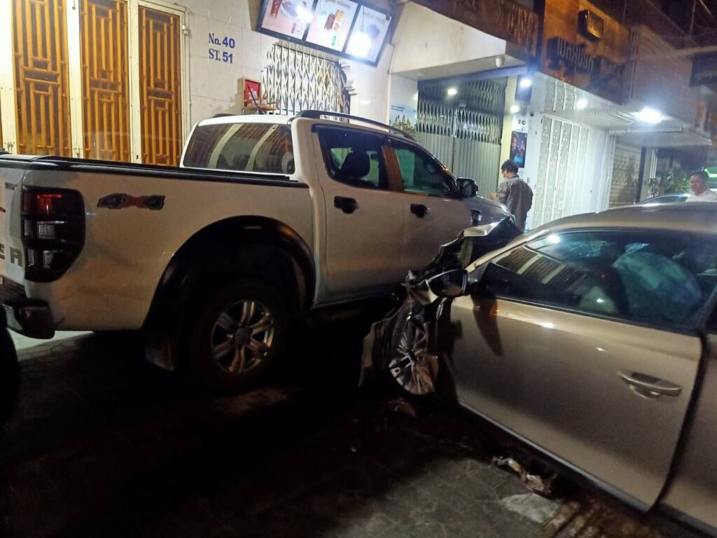 ភ្នំពេញ៖ មានរថយន្តស៊េរីទំនើបម៉ាក VOLVEGAN មួយគ្រឿងបើកបរក្នុងល្បឿនលឿនដល់ចំណុចផ្លូវបំបែកជាបួនមិងបន្ថយល្បឿនក៏ជ្រុលទៅបុករថយន្ត lexus 570 ពីចំហៀងខាងក្រោយពេញទំហឹង រួចបន្តទៅបុករថយន្ត Ford rancher មួយគ្រឿងទៀតចតស្ងៀមនៅមុខផ្ទះបណ្ដាលឱ្យរងការខូចខាតយ៉ាងដំណំ កាលពីវេលាម៉ោង ១២និង១០នាទីរំលងអាធ្រាត្រឈានចូលថ្ងៃទី២៣ ខែកក្កដា ឆ្នាំ ២០២២ នៅត្រង់ចំណុចផ្សារតាប៉ាង តាមបណ្តោយផ្លូវ១៣៦ កែងផ្លូវ៥១ ស្ថិតក្នុងសង្កាត់ផ្សារថ្មីទី៣ ខណ្ឌដូនពេញរាជធានីភ្នំពេញ។