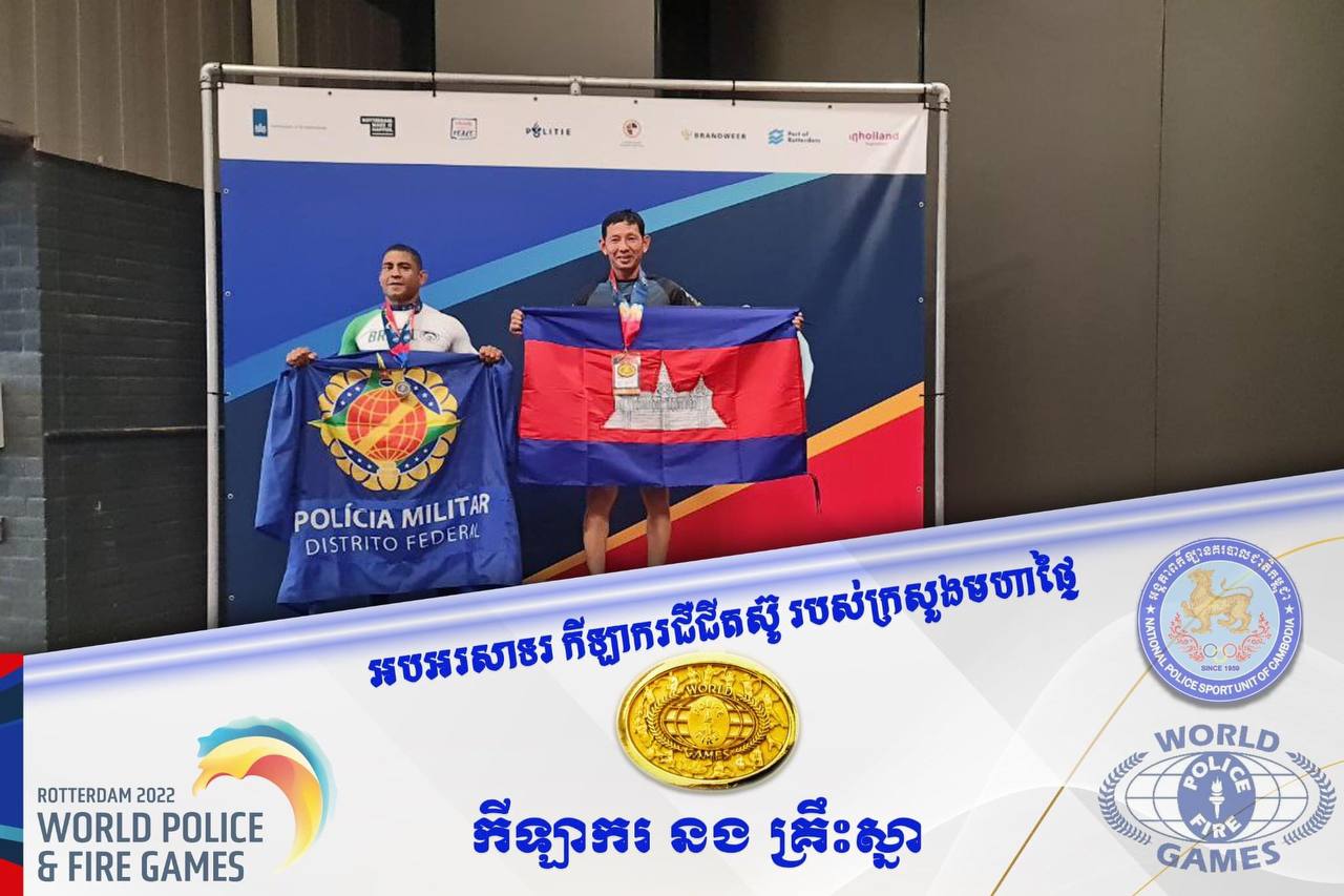 ហូឡង់៖ អបអរសាទរ កីឡាករ នង គ្រឹះស្នា ដណ្តើមបានមេដាយមាស ១គ្រឿងដែលជាមេដាយមាសដំបូងជូនកម្ពុជា និងអង្គភាព លើវិញ្ញាសាJiu jitsu អាយុ ៤០ឆ្នាំឡើង ក្នុងប្រភេទទម្ងន់ក្រោម៧៤គីឡូក្រាម ពីព្រឹត្តិការណ៍កីឡានគរបាល និងកងពន្លត់អគ្គិភ័យពិភពលោក លើកទី១៩ ឆ្នាំ២០២២ The 19th World Police and Fire Games នៅទីក្រុង Rotterdam ប្រទេសហូឡង់ ។