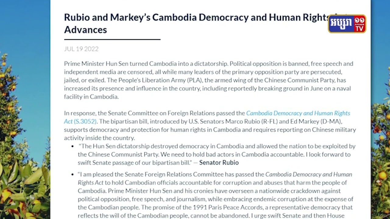 ព្រឹទ្ធសភានៃប្រទេសកម្ពុជាបានចេញសេចក្តីថ្លែងការណ៍បដិសេធសេចក្តីព្រាងច្បាប់ដាក់ ចេញដោយសមាជិកព្រឹទ្ធសភាអាមេរិក២រូបស្តីពី “ប្រជាធិបតេយ្យ និងសិទ្ធិមនុស្សនៅកម្ពុជា”។