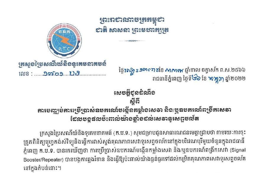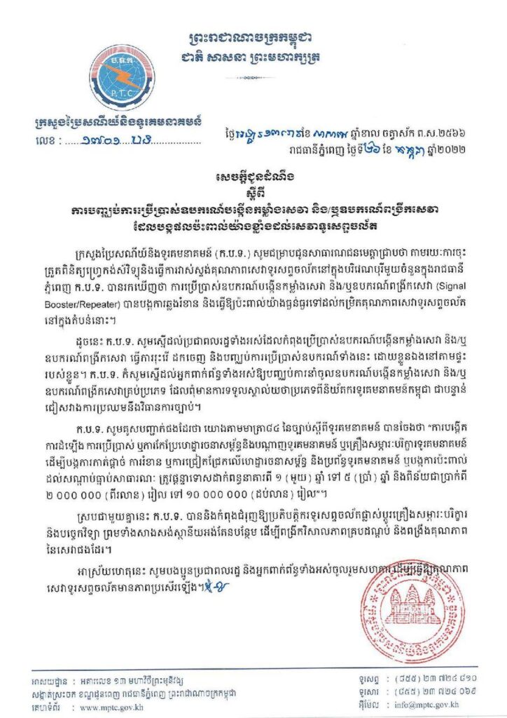 ការប្រើប្រាស់ឧបករណ៍បង្កើនកម្លាំងសេវា (Signal Booster/Repeater) បានបង្កការឆ្លងរំខាន និងធ្វើឱ្យប៉ះពាល់យ៉ាងធ្ងន់ធ្ងរដល់កម្រិតគុណភាពសេវាទូរសព្ទចល័តនៅក្នុងតំបន់នោះ