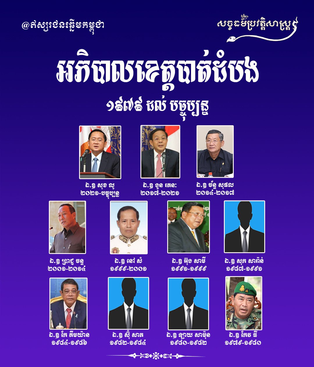 អភិបាលខេត្ដបាត់ដំបង ១៩៧៩ ដល់ បច្ចុប្បន្នសច្ចធម៌ប្រវត្តិសាស្ត្រអត្ថបទដោយ៖លី ប៊ុនហេង - Ly Bunheng #សច្ចធម៌ប្រវត្ដិសាស្រ្ដ #ព្រះរាជាណាចក្រកម្ពុជា #អតីតកាល #បច្ចុប្បន្ន #អភិបាលខេត្ដបាត់ដំបង #ឥស្សរជនឆ្នើមកម្ពុជា Facebook Page: សច្ចធម៌ប្រវត្ដិសាស្រ្ដTelegram Channel លី ប៊ុនហេង - Ly Bunhengលី ប៊ុនហេង ប្រធានផ្នែកផ្សព្វផ្សាយ នៃសច្ចធម៌ប្រវត្តិសាស្រ្ដអត្ថបទមុនអត្ថបទបន្ទាប់