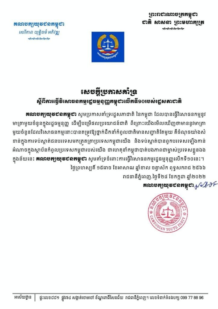 គណបក្សយុវជនកម្ពុជាប្រកាសគាំទ្រការអនុម័តសេចក្តីព្រាងច្បាប់ធម្មនុញ្ញលើកទី១០