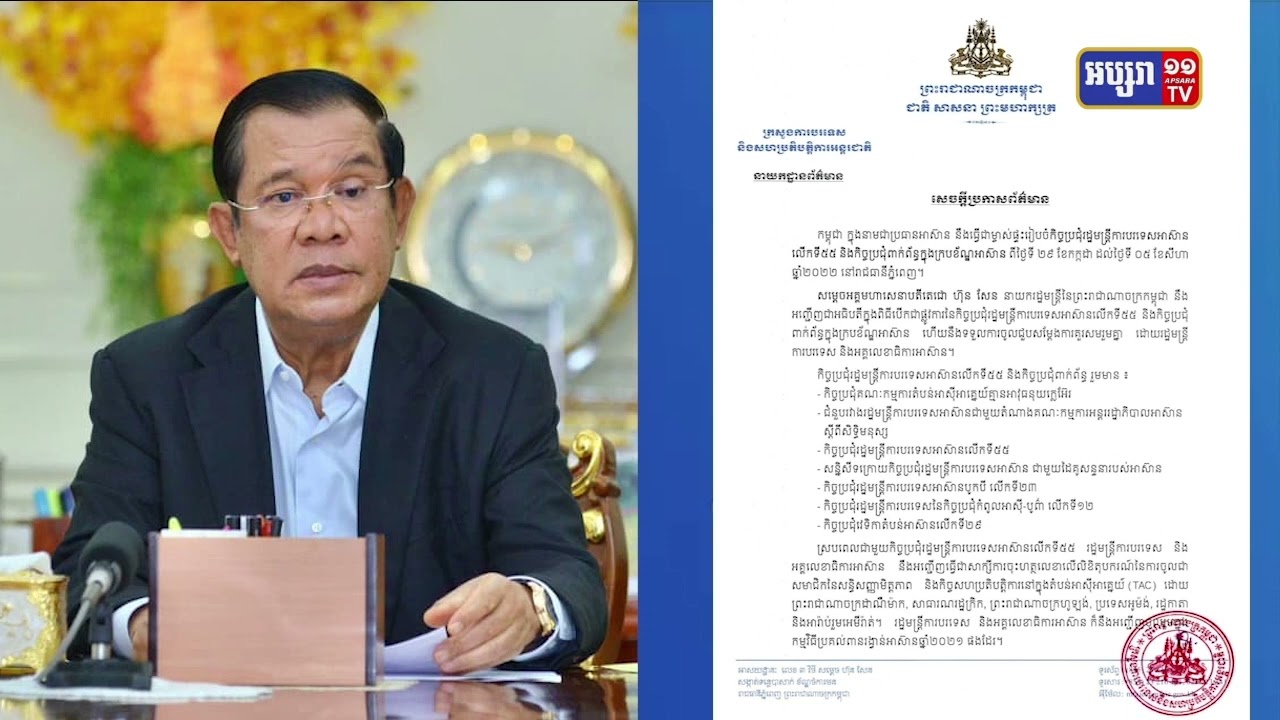 សម្តេចនាយករដ្ឋមន្ត្រីកម្ពុជា នឹងអញ្ជើញជាអធិបតីក្នុងពិធីបើកជាផ្លូវការនៃកិច្ចប្រជុំរដ្ឋមន្ត្រី ការបរទេសអាស៊ានលើកទី៥៥ និងកិច្ចប្រជុំពាក់ព័ន្ធក្នុងក្របខ័ណ្ឌអាស៊ាន ដែលនឹងចាប់ផ្តើម ថ្ងៃទី២៩កក្កដានេះ។ កិច្ចប្រជុំរដ្ឋមន្ដ្រីការបរទេសអាស៊ាន លើកទី៥៥ និងកិច្ចប្រជុំពាក់ព័ន្ធ ក្នុងក្របខ័ណ្ឌអាស៊ានដែលកម្ពុជានឹងធ្វើជាម្ចាស់ផ្ទះ នឹងមានរវាងពីថ្ងៃទី ២៩កក្កដារហូត ដល់ ថ្ងៃទី៥ ខែសីហា ឆ្នាំ២០២២នៅរាជធានីភ្នំពេញ។ អប្សរាណិតធ្វើសេចក្ដីរាយការណ៍