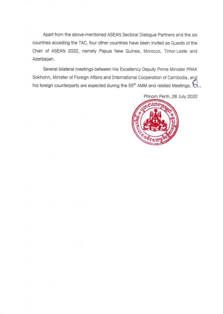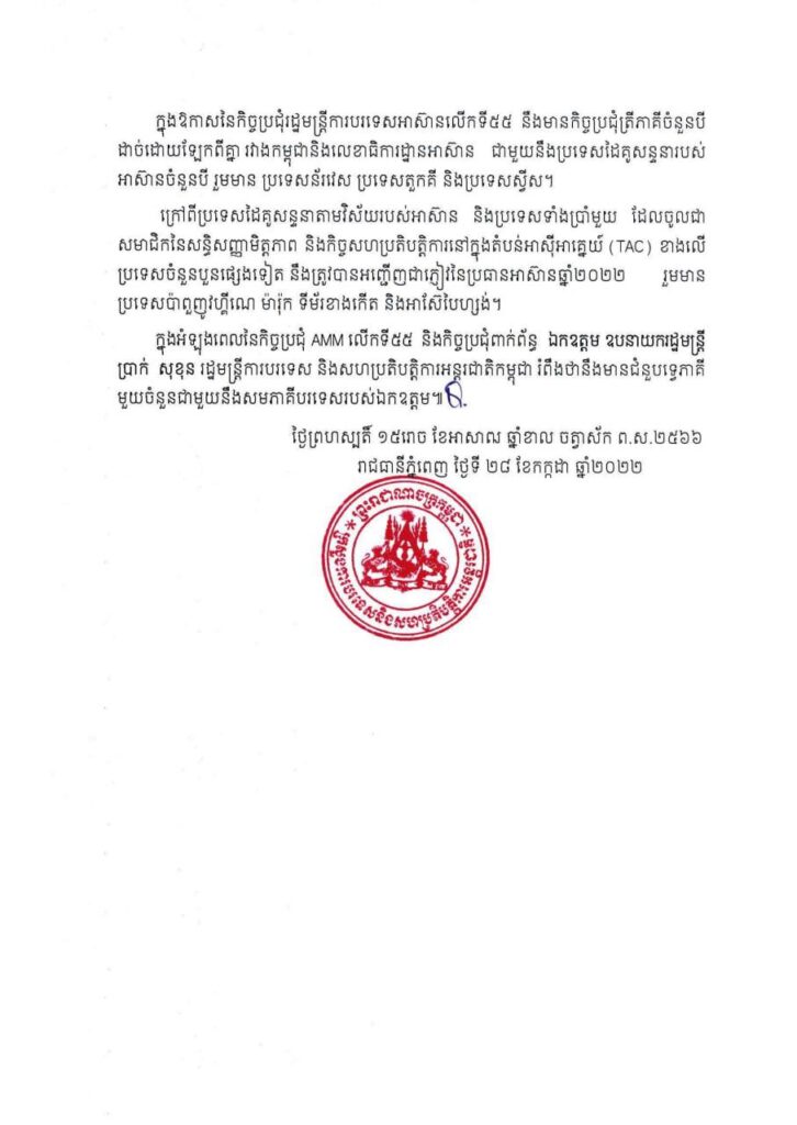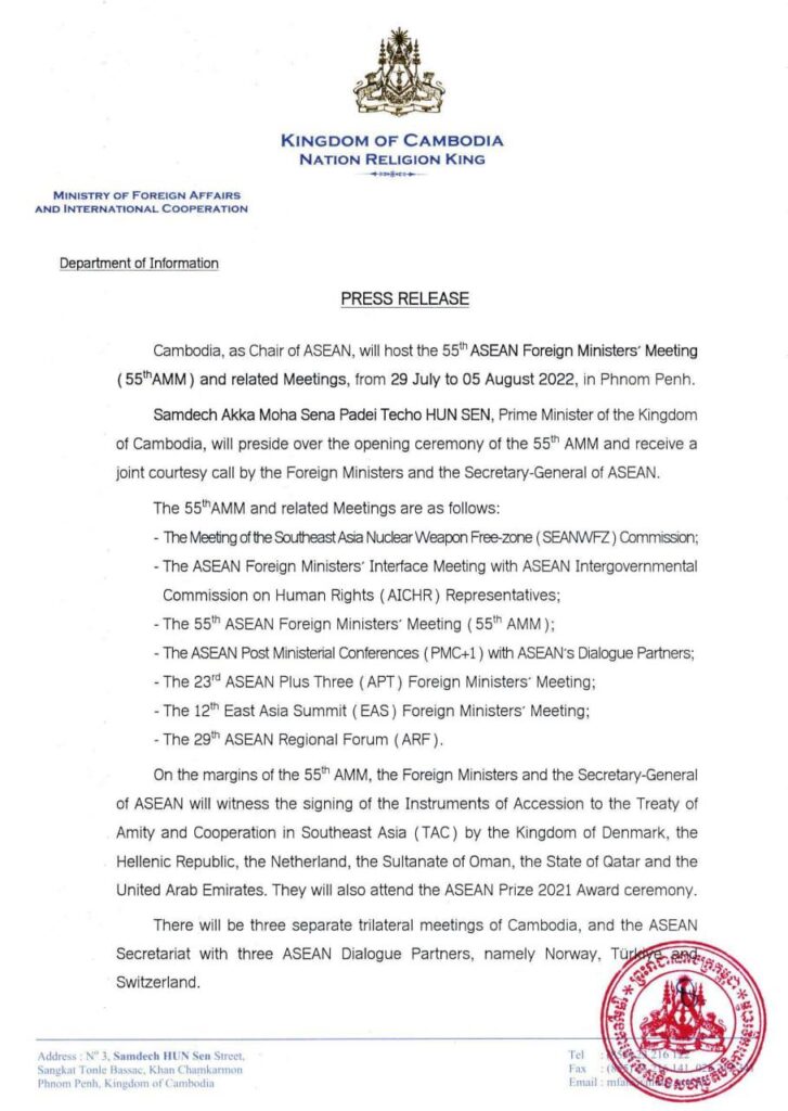 សេចក្តីប្រកាស ព័ត៌មានរបស់ក្រសួងការបរទេសកាលពីថ្ងៃ២៨ខែកក្កដាបានបញ្ជាក់ឱ្យដឹងថា សម្តេចតេជោ ហ៊ុន សែន នាយករដ្ឋមន្រ្តីនៃកម្ពុជា នឹងអញ្ជើញជាអធិបតីក្នុងពិធីបើកជាផ្លូវការនៃកិច្ចប្រជុំរដ្ឋមន្រ្តីការបរទេសអាស៊ានលើកទី៥៥ និងកិច្ចប្រជុំ ពាក់ព័ន្ធក្នុងក្របខ័ណ្ឌអាស៊ាន ហើយនឹងទទួលការចូលជួបសម្តែងការគួរសមរួមគ្នា ដោយរដ្ឋមន្រ្តីការបរទេស និងអគ្គលេខាធិការអាស៊ាន។
