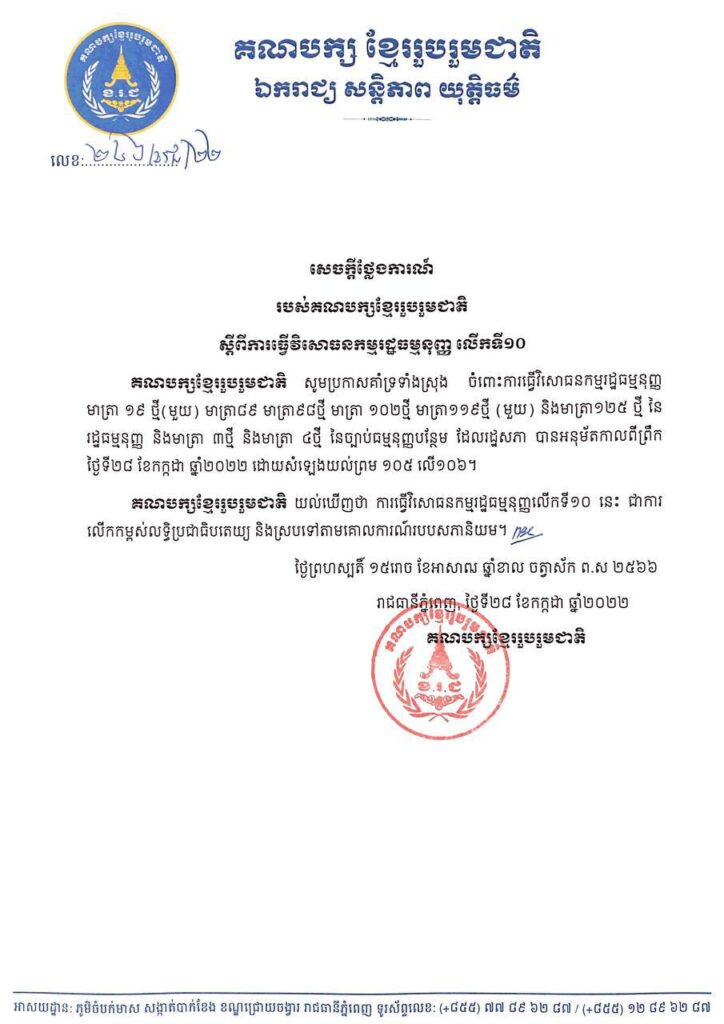 ភ្នំពេញ៖ គណបក្សខ្មែររួបរួមជាតិ បានប្រកាសគាំទ្រទាំងស្រុង ចំពោះការធ្វើវិសោធនកម្មរដ្ឋធម្មនុញ្ញ មាត្រា ១៩ ថ្មី(មួយ) មាត្រា៨៩ មាត្រា៩៨ថ្មី មាត្រា ១០២ថ្មី មាត្រា១១៩ថ្មី (មួយ) និងមាត្រា១២៥ ថ្មី នៃរដ្ឋធម្មនុញ្ញ និងមាត្រា ៣ថ្មី និងមាត្រា ៤ថ្មី នៃច្បាប់ធម្មនុញ្ញបន្ថែម ដែលរដ្ឋសភា បានអនុម័តកាលពីព្រឹកថ្ងៃទី២៨ ខែកក្កដា ឆ្នាំ២០២២ ដោយសំឡេងយល់ព្រម ១០៥ លើ១០៦។ នេះបើយោងតាមសេចក្តីថ្លែងការណ៍របស់គណបក្សខ្មែររួបរួមជាតិ កាលពីថ្ងៃទី២៨ ខែកក្កដា ឆ្នាំ២០២២។ គណបក្សខ្មែររួបរួមជាតិ បានយល់ឃើញថា ការធ្វើវិសោធនកម្មរដ្ឋធម្មនុញ្ញលើកទី១០នេះ ជាការ លើកកម្ពស់លទ្ធិប្រជាធិបតេយ្យ និងស្របទៅតាមគោលការណ៍របបសភានិយម។