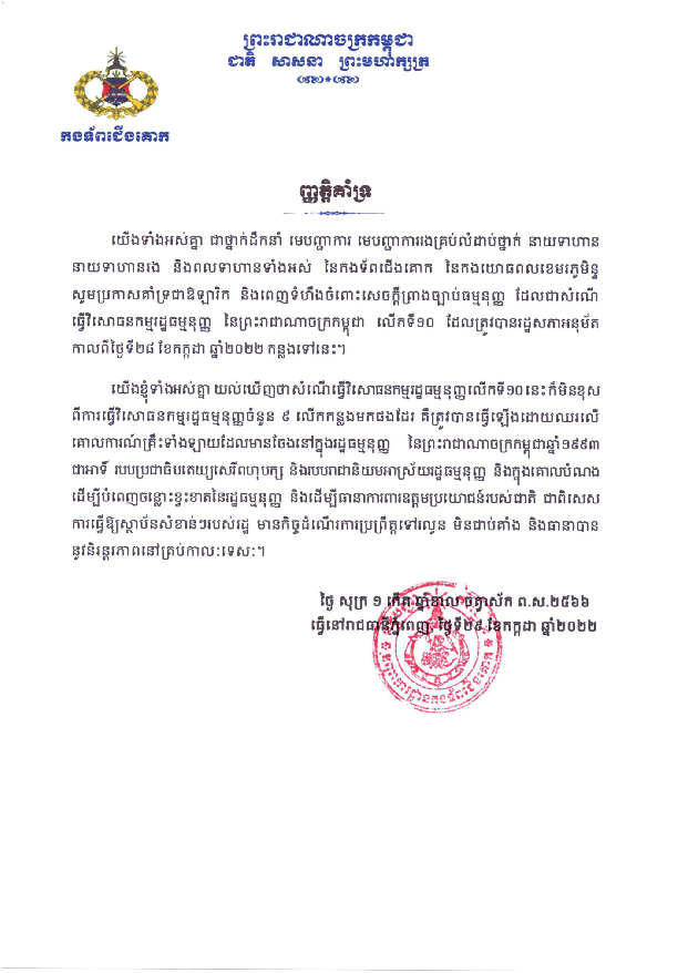 ភ្នំពេញ៖ ថ្នាក់ដឹកនាំ មេបញ្ជាការ មេបញ្ជាការរងគ្រប់លំដាប់ថ្នាក់ នាយទាហាន នាយទាហានរង និងពលទាហានទាំងអស់ នៃកងទ័ពជើងគោក នៃកងយោធពលខេមរភូមិន្ទ ប្រកាសគាំទ្រជាឱឡារិក និងពេញទំហឹងចំពោះសេចក្តីព្រាងច្បាប់ធម្មនុញ្ញ ដែលជាសំណើធ្វើវិសោធនកម្មរដ្ឋធម្មនុញ្ញ នៃព្រះរាជាណាចក្រកម្ពុជា លើកទី១០ ដែលត្រូវបានរដ្ឋសភាអនុម័ត កាលពីថ្ងៃទី២៨ ខែកក្កដា ឆ្នាំ២០២២កន្លងទៅនេះ។ នេះបើយោងតាមញ្ញត្តិគាំទ្រកាលពីថ្ងៃទី២៨ ខែកក្កដា ឆ្នាំ២០២២។