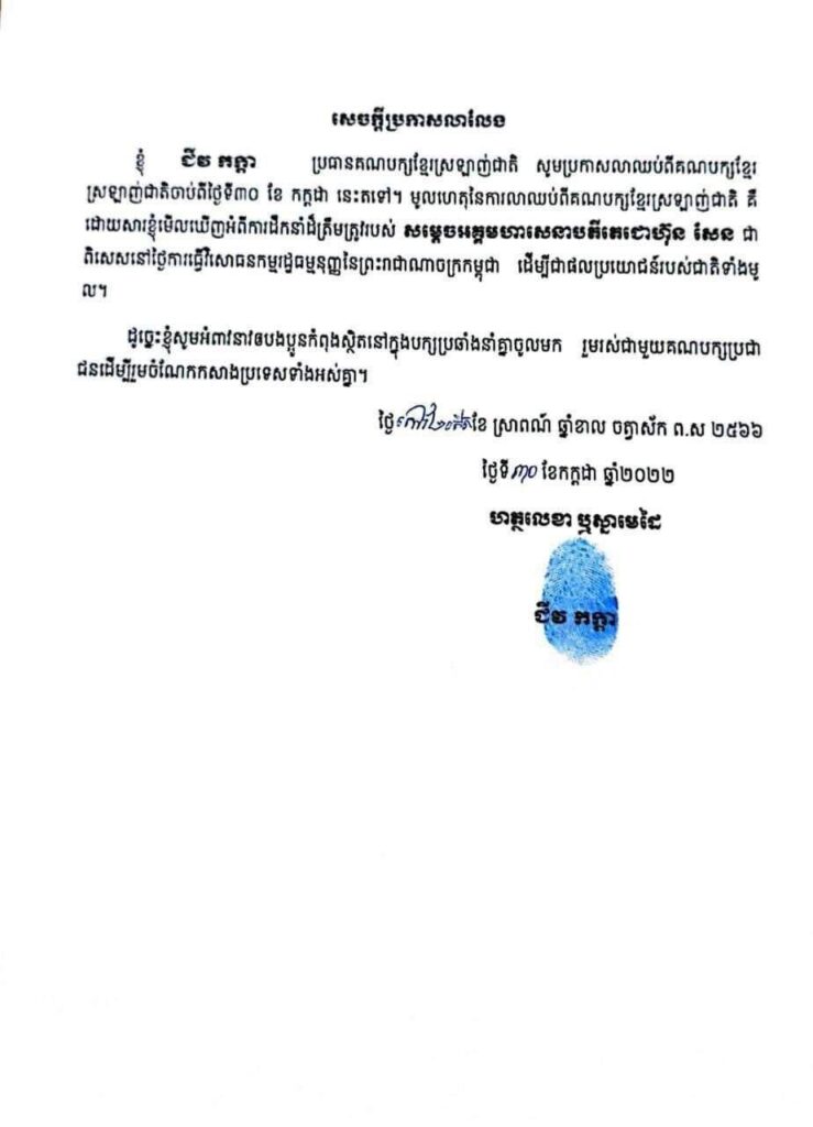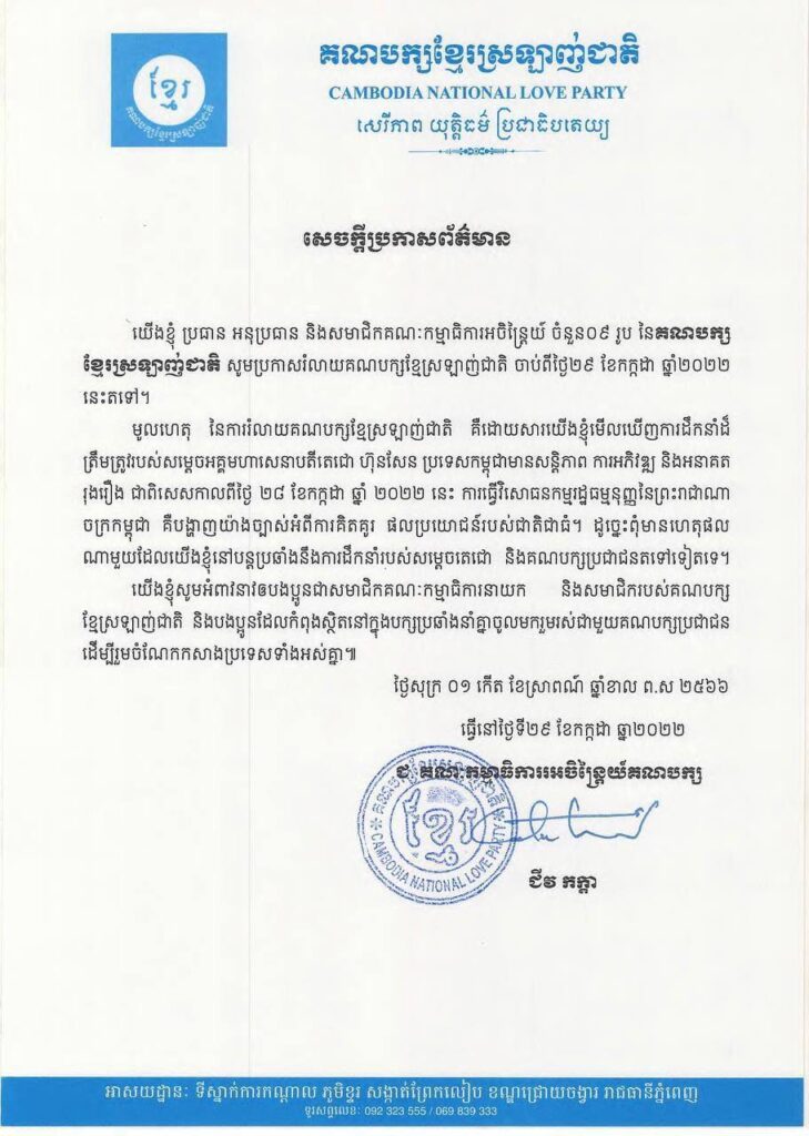 សូមជម្រាបថា ប្រធាន អនុប្រធាន រួមទាំងសមាជិកគណៈកម្មាធិការអចិន្ត្រៃយ៍សរុប ៩រូបរបស គណបក្សខ្មែស្រឡាញ់ជាតិ បានប្រកាសរំលាយគណបក្សរបស់ខ្លួន ចាប់ពីនៅថ្ងៃទី២៩ ខែកក្កដា ឆ្នាំ២០២២ ។ ការប្រកាសរំលាយនេះ ដោយដោយសារមើលឃើញការដឹកនាំដ៏ត្រឹមត្រូវរបស់សម្ដេចអគ្គមហាសេនាបតីតេជោ ហ៊ុន សែន មានការការអភិវឌ្ឍ និងអនាគតរុងរឿង។