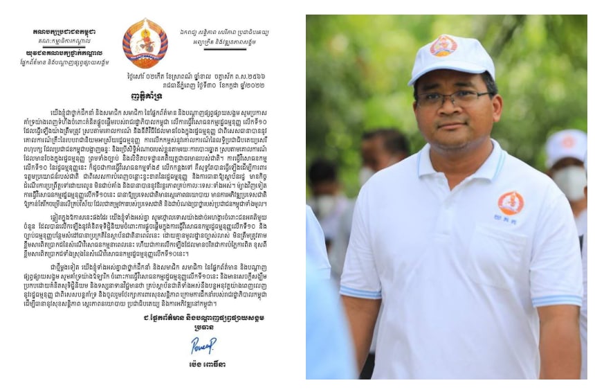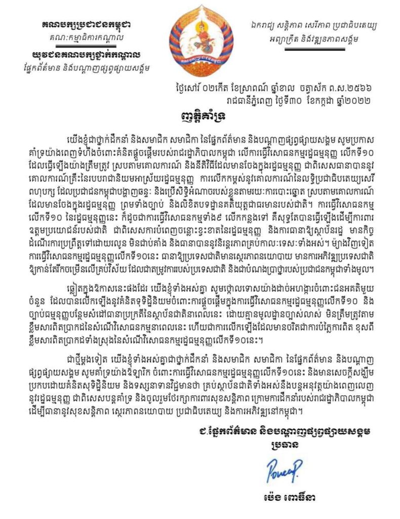 យើងខ្ញុំជាថ្នាក់ដឹកនាំ និងសមាជិក សមាជិកា នៃផ្នែកព័ត៌មាន និងបណ្តាញផ្សព្វផ្សាយសង្គម សូមប្រកាស គាំទ្រយ៉ាងពេញទំហឹងចំពោះគំនិតផ្តួចផ្តើមរបស់រាជរដ្ឋាភិបាលកម្ពុជា លើការធ្វើវិសោធនកម្មរដ្ឋធម្មនុញ្ញ លើកទី១០ ដែលធ្វើឡើងយ៉ាងត្រឹមត្រូវ ស្របតាមគោលការណ៍ និងនីតិវិធីដែលមានចែងក្នុងរដ្ឋធម្មនុញ្ញ ជាពិសេសធានាបាននូវ គោលការណ៍គ្រឹះនៃរបបរាជានិយមអាស្រ័យរដ្ឋធម្មនុញ្ញ ការលើកកម្ពស់នូវគោលការណ៍នៃលទ្ធិប្រជាធិបតេយ្យសេរី ពហុបក្ស ដែលប្រជាជនកម្ពុជាបង្ហាញឆន្ទៈ និងប្រើសិទ្ធិអំណាចរបស់ខ្លួនតាមរយៈការបោះឆ្នោត ស្របតាមគោលការណ៍ ដែលមានចែងក្នុងរដ្ឋធម្មនុញ្ញ ព្រមទាំងច្បាប់ និងលិខិតបទដ្ឋានគតិយុត្តជាធរមានរបស់ជាតិ។