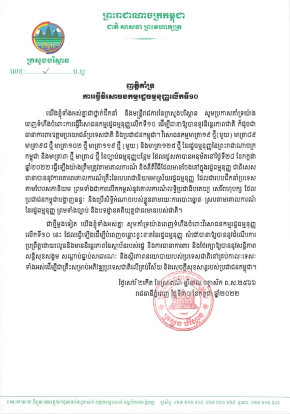 ថ្នាក់ដឹកនាំ និងមន្រ្តីរាជការនៃក្រសួងបរិស្ថាន សូមប្រកាសគាំទ្រយ៉ាងពេញទំហឹងចំពោះការធ្វើវិសោធនកម្មរដ្ឋធម្មនុញ្ញលើកទី១០ ដើម្បីធានាឱ្យបាននូវនិរន្តរភាពជាតិ ក៏ដូចជាធានាការពារឧត្តមប្រយោជន៍ប្រទេសជាតិ និងប្រជាជនកម្ពុជា។