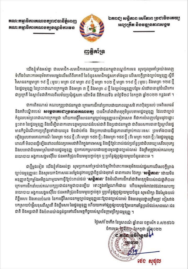 សមាជិកគណបក្សប្រជាជនកម្ពុជាខណ្ឌចំការមនប្រកាសគាំទ្រវិសោធនកម្ម រដ្ឋធម្មនុញ្ញ នៃព្រះរាជាណាចក្រកម្ពុជា លើកទី១០