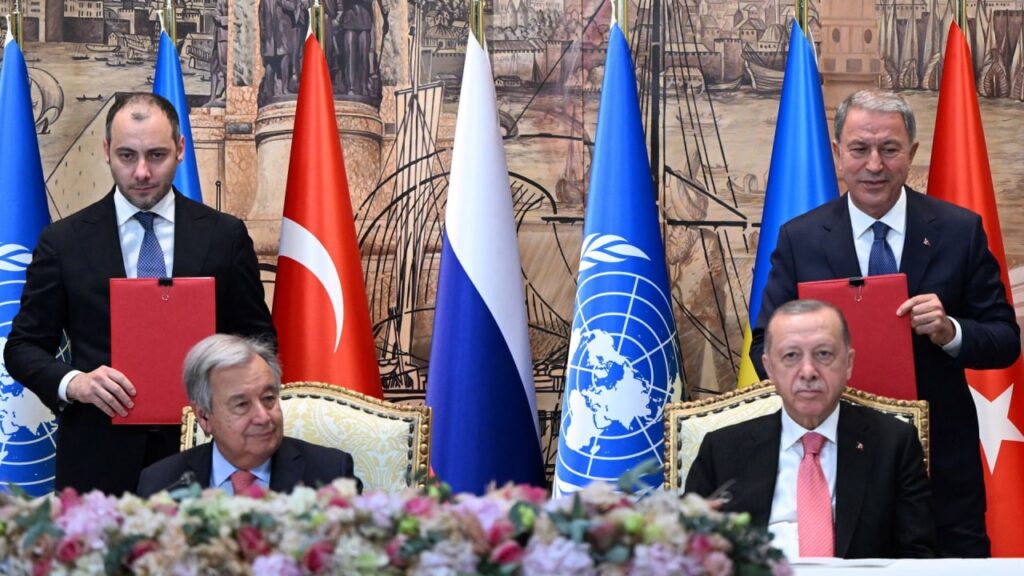 អ្នកនាំពាក្យប្រធានាធិបតីតួកគីលោក អ៊ីប្រាហ៊ីម ខាលីន បានប្រាប់ប្រព័ន្ធផ្សព្វផ្សាយក្នុងស្រុកនៅថ្ងៃអាទិត្យសប្តាហ៍មុនថា កប៉ាល់ទីមួយដែលដឹកគ្រាប់ធញ្ញជាតិអ៊ុយក្រែនអាចនឹងចាកចេញនៅព្រឹកថ្ងៃចន្ទនេះ លោកថា ការផ្ទុកទំនិញលើកប៉ាល់ត្រូវបានបញ្ចប់ហើយ។ តួកគី និងអង្គការសហប្រជាជាតិបានដើរតួនាទីជាអ្នកសម្របសម្រួលសម្រាប់កិច្ចព្រមព្រៀងរវាងអ៊ុយក្រែន និងរុស្ស៊ី ដើម្បីចាប់ផ្តើមការនាំចេញស្រូវសាលីរបស់អ៊ុយក្រែន និងគ្រាប់ធញ្ញជាតិផ្សេងទៀតតាមរយៈច្រកសមុទ្រខ្មៅ។ រដ្ឋមន្ត្រីការបរទេសអាមេរិកលោក អាន់ថូនី ប្លីងគែន បានជំរុញឱ្យសមភាគីរុស្ស៊ីលោក សឺហ្គៃ ឡារូវ អនុវត្តឱ្យបានពេញលេញតាមកិច្ចព្រមព្រៀងខាងលើនេះ នៅពេលពួកលោកនិយាយគ្នាតាមទូរស័ព្ទកាលពីថ្ងៃសុក្រសប្តាហ៍មុន។