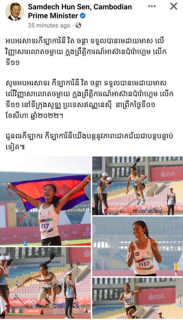 សម្ដេចតេជោ ហ៊ុន សែន អបអរសាទរដល់កីឡាការិនី វិត ចន្ថា ទទួលបានមេដាយមាស លើវិញ្ញាសារលោតចម្ងាយ ក្នុងព្រឹត្តិការណ៍អាស៊ានប៉ារ៉ាហ្គេម លើកទី១១