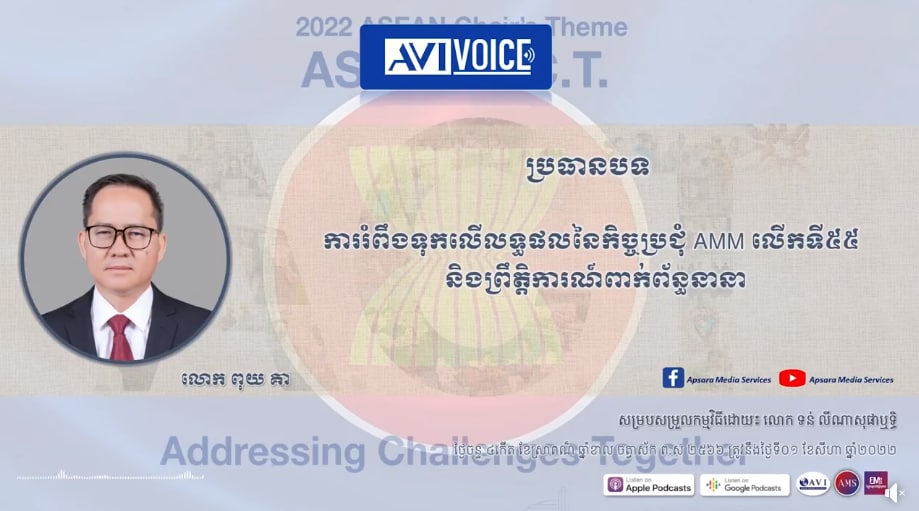 ស្តាប់អ្នកសារព័ត៌មានជើងចាស់ លោក ពុយ គា និយាយពីបញ្ហាប្រឈម និងឱកាសនានាដែលកម្ពុជាទទួលបានក្នុងកិច្ចប្រជុំរដ្ឋមន្ត្រីការបរទេសអាស៊ានលើកទី៥៥ (55th AMM) ដែលកម្ពុជាធ្វើជាម្ចាស់ផ្ទះ ពីថ្ងៃទី៣០ កក្កដា – ៦ សីហា។ លោកក៏បានពន្យល់ពីមូលហេតុចំបាច់ក្នុងការដោះស្រាយបញ្ហានៅមីយ៉ាន់ម៉ាឱ្យបានឆាប់