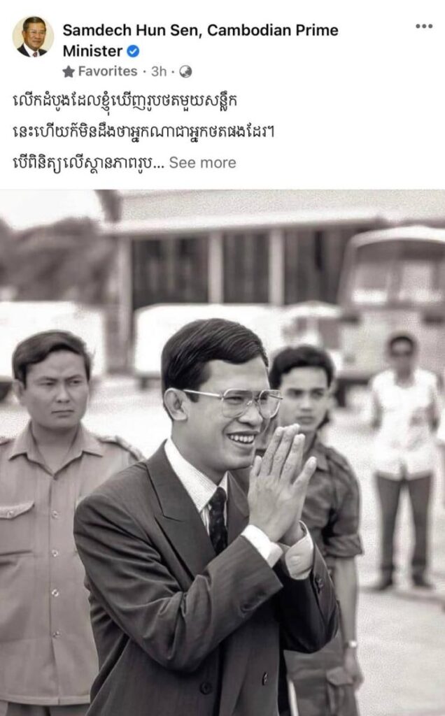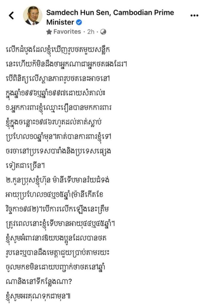 សូមបញ្ជាក់ថា កន្លងមក សម្តេចតេជោ ហ៊ុន សែន តែងតែបង្ហោះរូបចាស់ៗ របស់សម្តេច ហើយរូបខ្លះ មានប្រភពថតដោយកាសែតបរទេស ដែលរហូតដល់មានការដាក់លក់រូបនោះ តាមប្រព័ន្ធអនឡាញ មានតម្លៃទៅតាមប្រភេទរូបហ្វីក និងវីដេអូផងដែរ។ ជាក់ស្តែង រូបភាពសម្តេចបង្ហោះនៅព្រឹកថ្ងៃទី៣០កក្កដា សម្តេចតេជោ បានកត់សំគាល់ថា សម្តេចមិនច្បាស់ថា អ្នកណាជាអ្នកថតរូបនោះទេ ប៉ុន្តែបើពិនិត្យលើស្ថានភាពរូបថតនេះ អាចនៅក្នុងឆ្នាំ១៩៩៦ ឬឆ្នាំ១៩៩៧ដោយសំគាល់៖ ១.អ្នកការពារឈ្មោះ វឿន បានមកការពារសម្ដេចក្នុងចន្លោះ១៩៨៦ រហូតដល់គាត់ស្លាប់ ប្រហែល១០ឆ្នាំមុន។ គាត់បានការពារសម្តេច ទៅចរចានៅប្រទេសបារាំង និងប្រទេសផ្សេងទៀតជាច្រើន។ ២.កូនប្រុសសម្តេច គឺលោក ហ៊ុន ម៉ានី ទើបមានវ័យជំទង់ អាយុប្រហែល១៤ ឬ ១៥ឆ្នាំ (ម៉ានីកើតខែវិច្ឆិកា១៩៨២)។ ពេលនោះ សម្តេចទើបមានអាយុ៤៤ ឬ ៤៥ឆ្នាំ ៕ ដោយ វណ្ណលុក