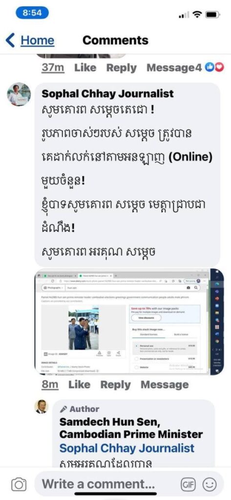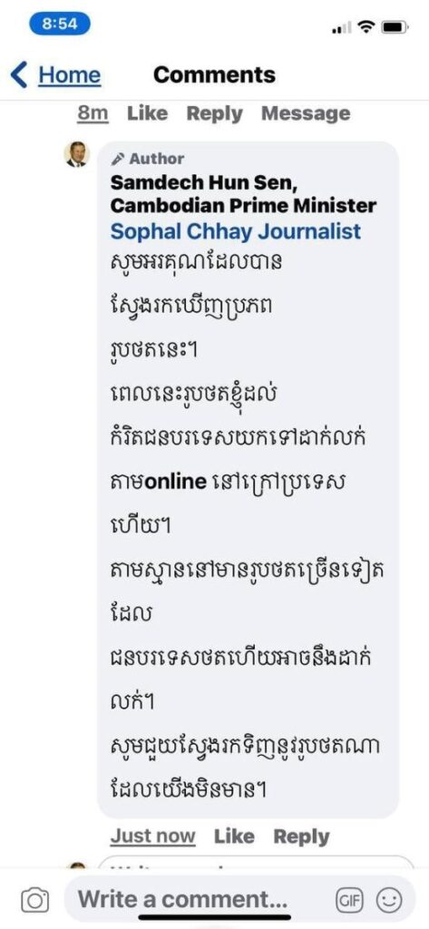 សម្តេចតេជោ ហ៊ុន សែន បានតបទៅហ្វេសប៊ុកឈ្មោះ Sophal Chhay Journalist វិញដែរថា សូមអរគុណដែលបានស្វែងរកឃើញប្រភពរូបថតនេះ។ ពេលនេះរូបថតខ្ញុំដល់ កំរិតជនបរទេសយកទៅដាក់លក់តាមonline នៅក្រៅប្រទេសហើយ។ តាមស្មាននៅមានរូបថតច្រើនទៀតដែលជនបរទេសថតហើយអាចនឹងដាក់លក់។ សូមជួយស្វែងរកទិញនូវរូបថតណាដែលយើងមិនមាន។