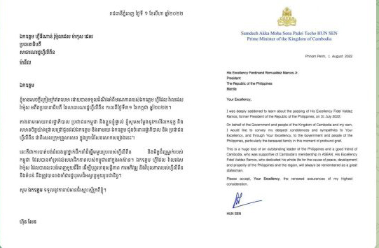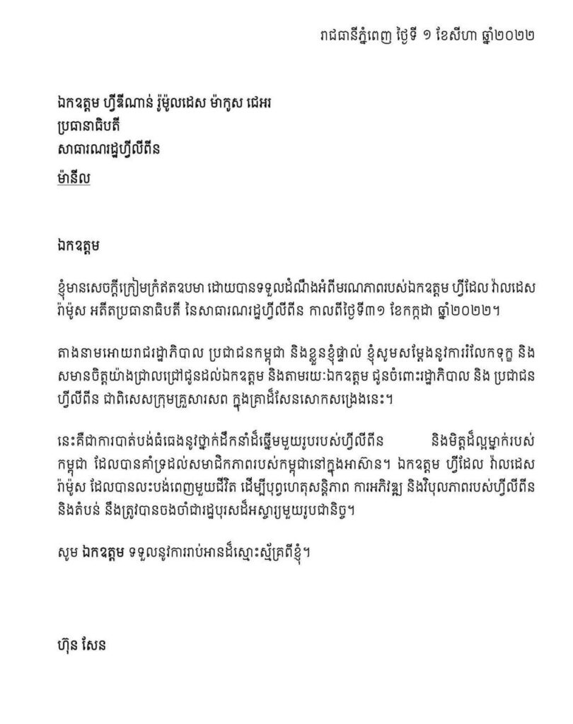 ភ្នំពេញ៖ សម្ដេចអគ្គមហាសេនាបតីតេជោ ហ៊ុន សែន នាយករដ្ឋមន្ត្រីនៃព្រះរាជាណាចក្រកម្ពុជា នៅថ្ងៃទី០១ ខែសីហា ឆ្នាំ២០២២នេះ បានផ្ញើសារលិខិតជូនលោក ហ្វីឌីណាន់ រ៉ូម៉ូលដេស ម៉ាកូស ជេអរ ប្រធានាធិបតីហ្វីលីពីន ដោយចូលរួមរំលែកទុក្ខចំពោះមរណភាពរបស់លោក ហ្វីដែល វាលដស រ៉ាម៉ូស អតីតប្រធានាធិបតីហ្វីលីពីន កាលពីថ្ងៃទី៣១ ខែកក្កដា ឆ្នាំ២០២២។