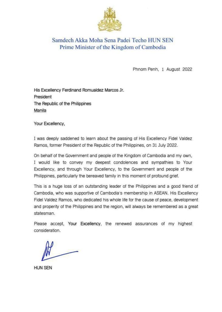 តាមរយៈសារលិខិតនេះសម្ដេចតេជោ ហ៊ុន សែន បានបញ្ជាក់បន្ថែមថា «ឯកឧត្តម ហ្វីដែល វ៉ាលដេស រ៉ាម៉ូស ដែលបានលះបង់ពេញមួយជីវិត ដើម្បីបុព្វហេតុសន្តិភាព ការអភិវឌ្ឍ និងវិបុលភាពរបស់ហ្វីលីពីន និងតំបន់ នឹងត្រូវបានចងចាំជារដ្ឋបុរសដ៏អស្ចារ្យមួយរូបជានិច្ច»៕