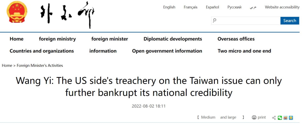 រដ្ឋមន្ត្រីការបរទេសចិន Wang Yi ថា លោកស្រី Pelosi បានបង្កើតសត្រូវរាប់ពាន់លាននាក់