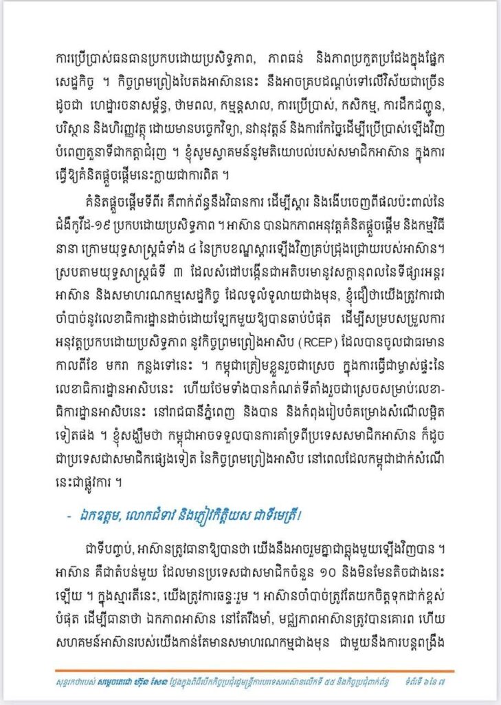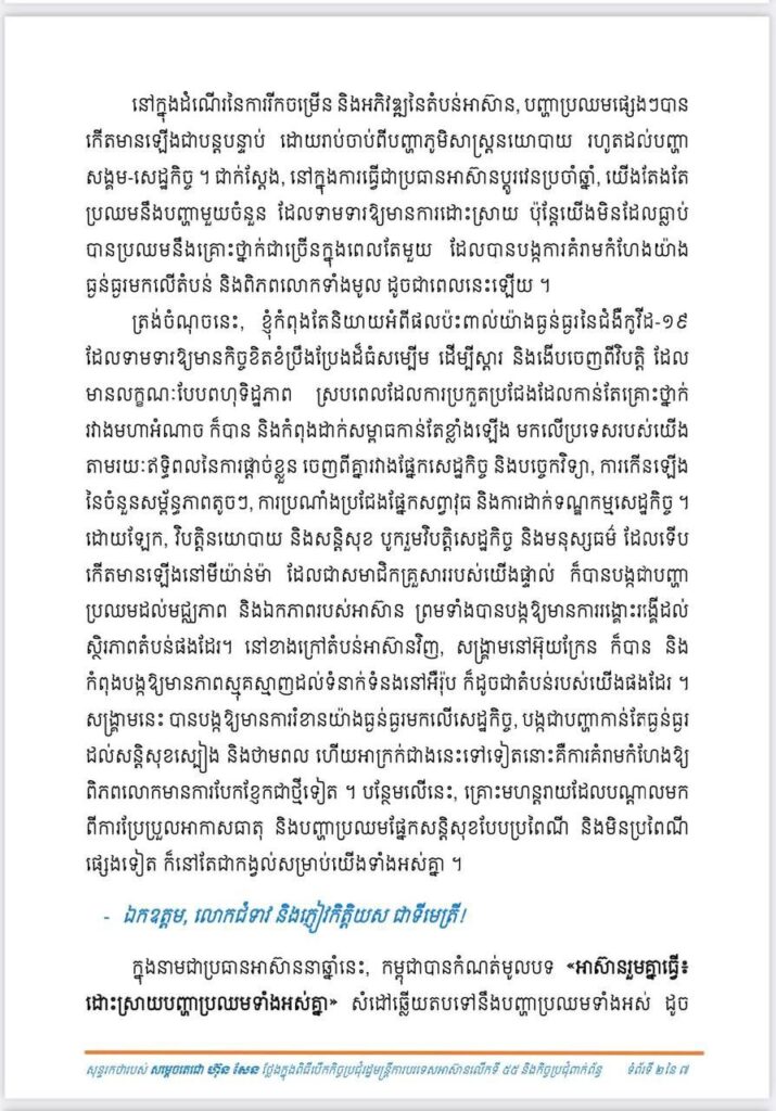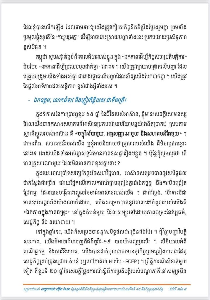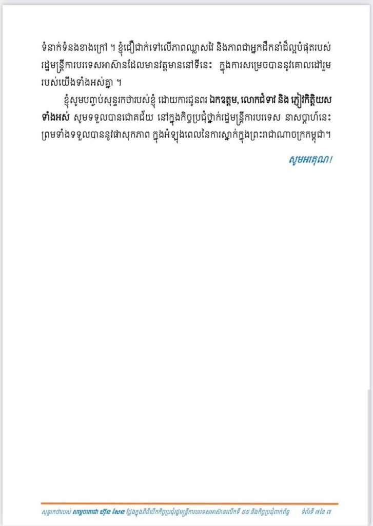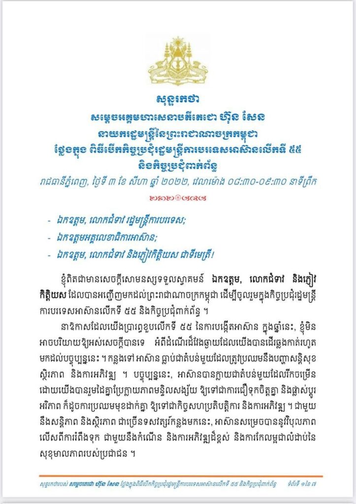 សន្ទរកថា សម្តេចអគ្គមហាសេនាបតីតេជោ ហ៊ុន សែន នាយករដ្ឋមន្ត្រី នៃព្រះរាជាណាចក្រកម្ពុជា និងជាប្រធានអាស៊ាន ឆ្នាំ២០២២ ថ្លែងក្នុងពិធីបើកកិច្ចប្រជុំរដ្ឋមន្ត្រីការបរទេសអាស៊ាន លើកទី៥៥ និងកិច្ចប្រជុំពាក់ព័ន្ធ ដែលប្រារព្ធធ្វើឡើងនៅសណ្ឋាគារសុខាភ្នំពេញ នៅព្រឹក្ងៃទី០៣ ខែសីហា ឆ្នាំ២០២២
