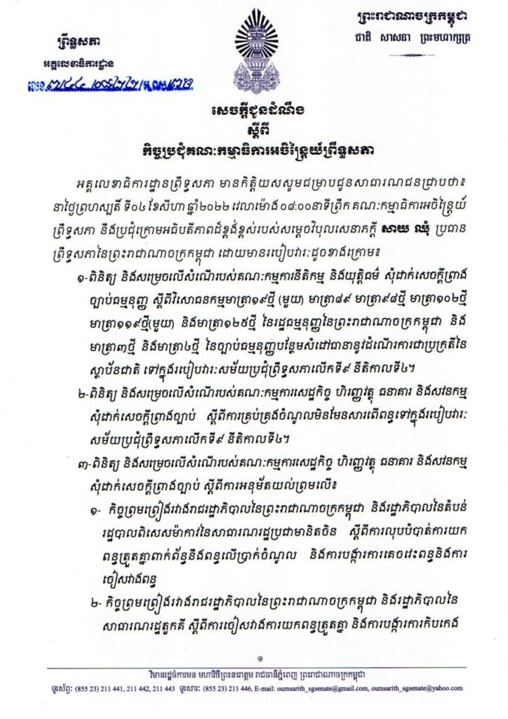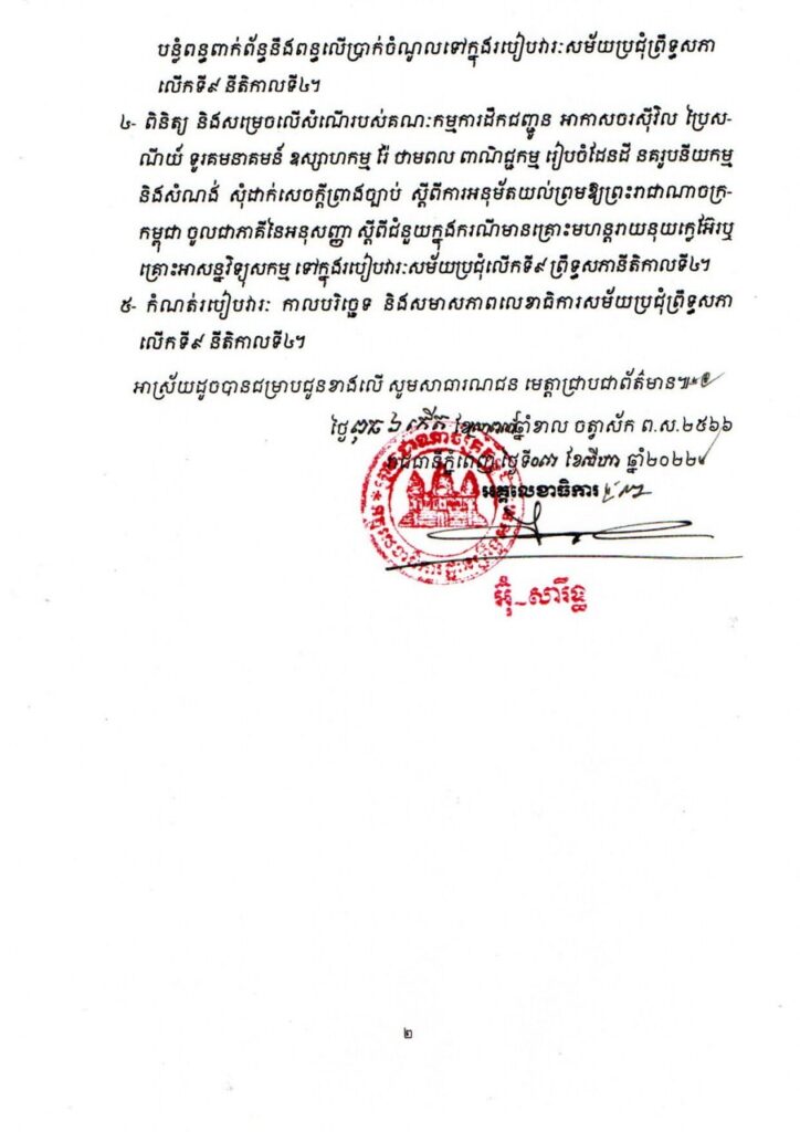 ៥កំណត់របៀបវារៈ កាលបរិច្ឆេទ និងសមាសភាពលេខាធិការសម័យប្រជុំព្រឹទ្ធសភា លើកទី៩ នីតិកាលទី៤៕ ដោយ / គ្រី សម្បត្តិ