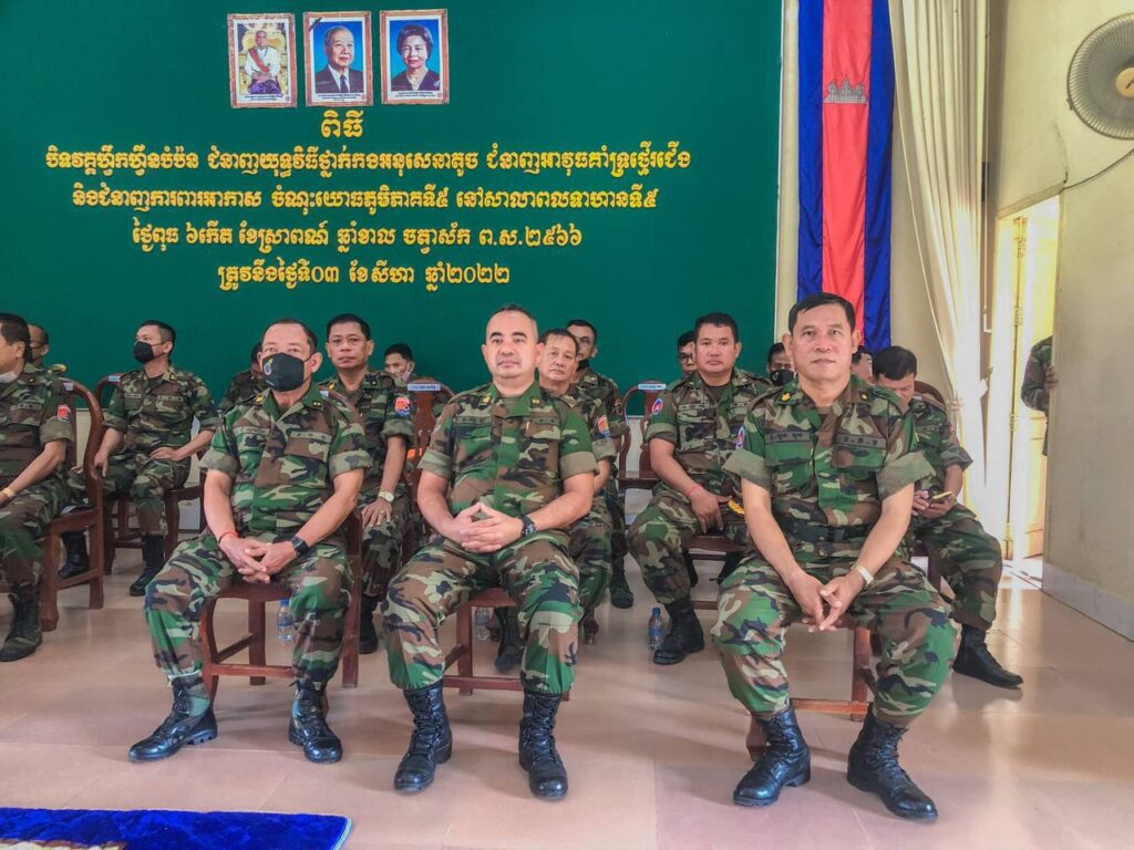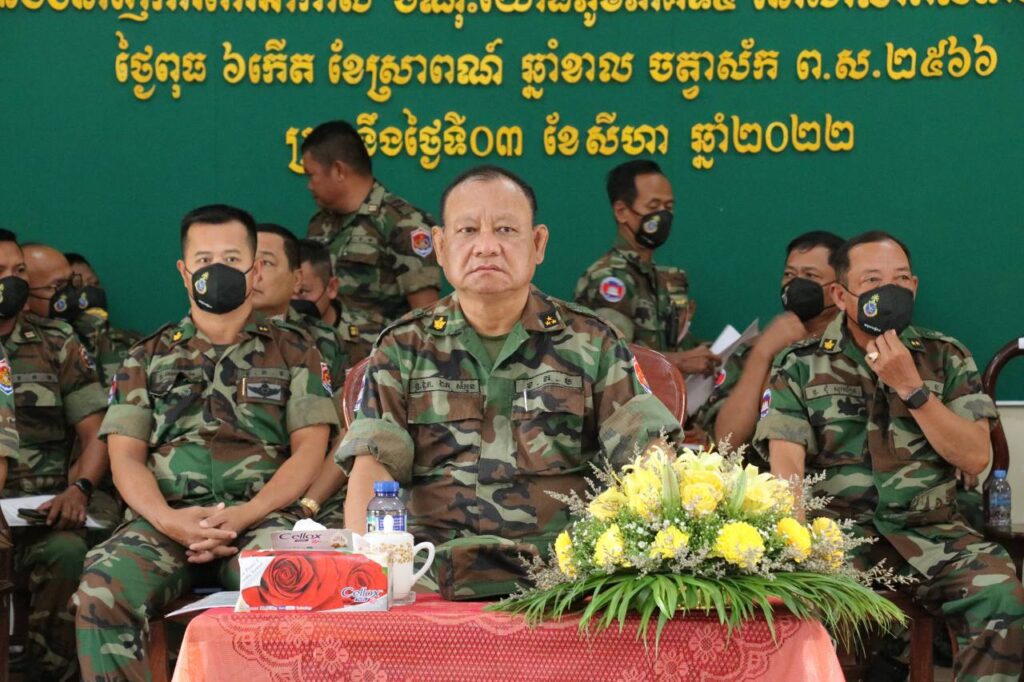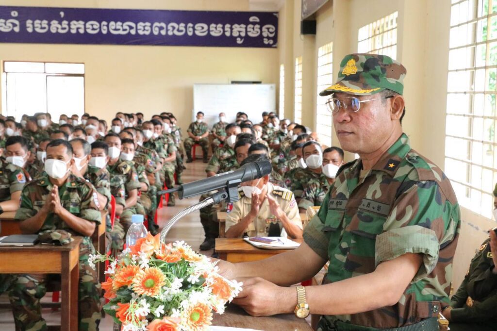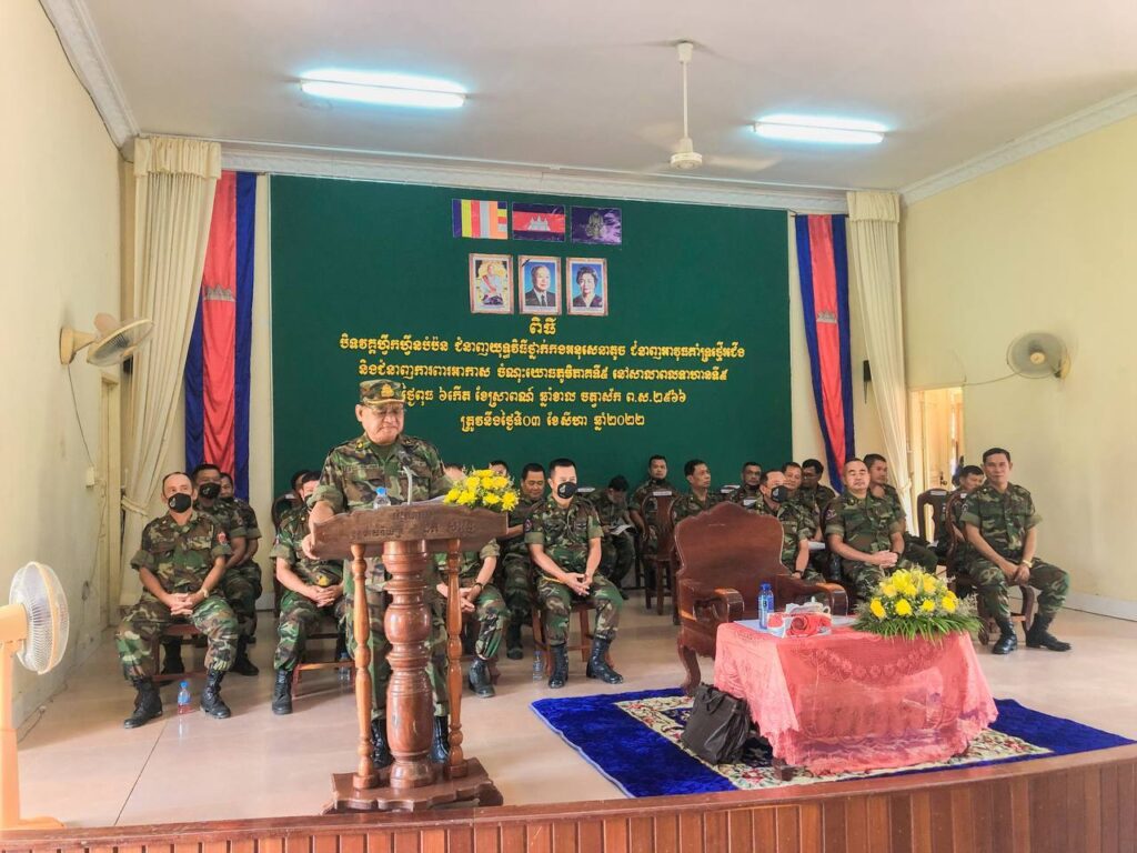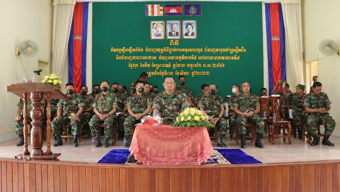 ខេត្តបាត់ដំបង៖ ឧត្តមសេនីយ៍ឯក ឯក សំអូន មេបញ្ជាការរងកងទ័ពជើងគោក មេបញ្ជាការយោធភូមិភាគទី៥ បានអញ្ជើញជាអធិបតីក្នុងពិធីបិទវគ្គហ្វឹកហ្វឺន បំប៉នយុទ្ធវិធីថ្នាក់កងអនុសេនាតូច បំប៉នជំនាញអាវុធគាំទ្រថ្មើរជើង និងបំប៉នជំនាញការពារអាកាស នៅសាលប្រជុំសាលាពលទាហានទី៥ យោធភូមិភាគទី៥ ស្ថិតនៅក្នុង ឃុំឈើទាល ស្រុកបាណន់ ខេត្តបាត់ដំបង នាព្រឹកថ្ងៃទី៣ ខែសីហា ឆ្នាំ២០២២ ។
