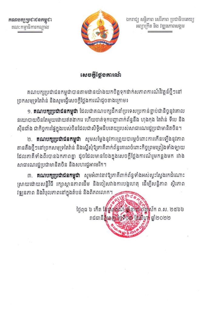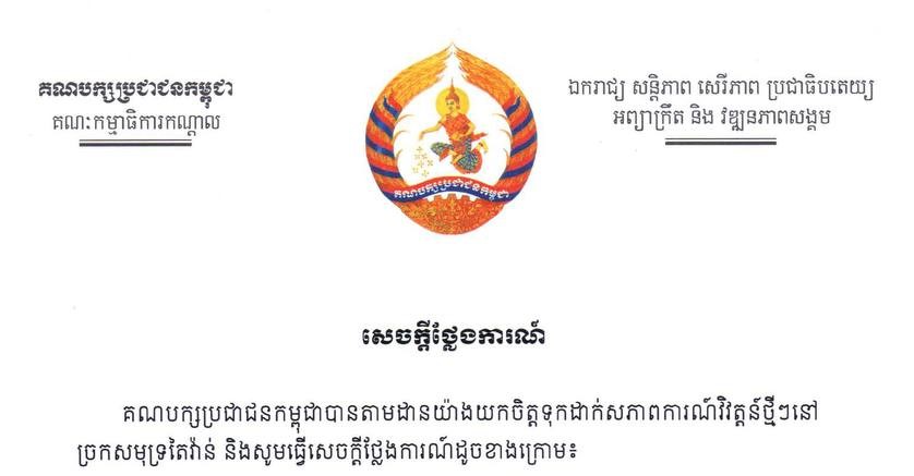 គណបក្សប្រជាជនកម្ពុជាសម្ដែងនូវការព្រួយបារម្ភចំពោះការកើនឡើងនូវភាពតានតឹងថ្មីៗនៅច្រកសមុទ្រតៃវ៉ាន់ និងស្នើសុំឱ្យភាគីពាក់ព័ន្ធគោរពចំពោះកិច្ចព្រមព្រៀងទាំងឡាយដែលបានឯកភាពគ្នាOne-Minuteអត្ថបទដោយ៖AMS OneMinute AMS OneMinuteអត្ថបទមុនអត្ថបទបន្ទាប់
