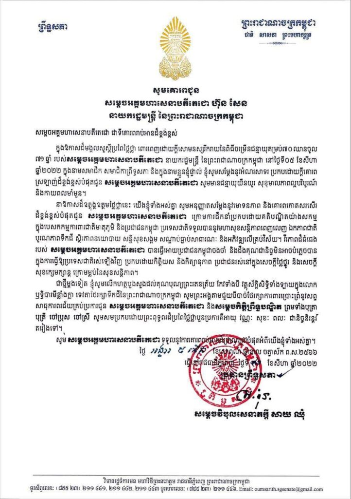 នៅក្នុងសារលិខិត សម្តេចវិបុលសេនាភក្តី តាងនាមឱ្យ សមាជិក សមាជិកាព្រឹទ្ធសភា និងក្នុងនាមសម្តេចផ្ទាល់ បានសម្តែងនូវអំណរសាទរ ប្រកបដោយក្តីគោរព ស្រឡាញ់ដ៏ខ្ពង់ខ្ពស់បំផុតជូន សម្តេចតេជោ សូមមានជន្មាយុយឺនយូរ សុខុមាលភាពល្អបរិបូរណ៍ និងកាយពលមាំមួន។