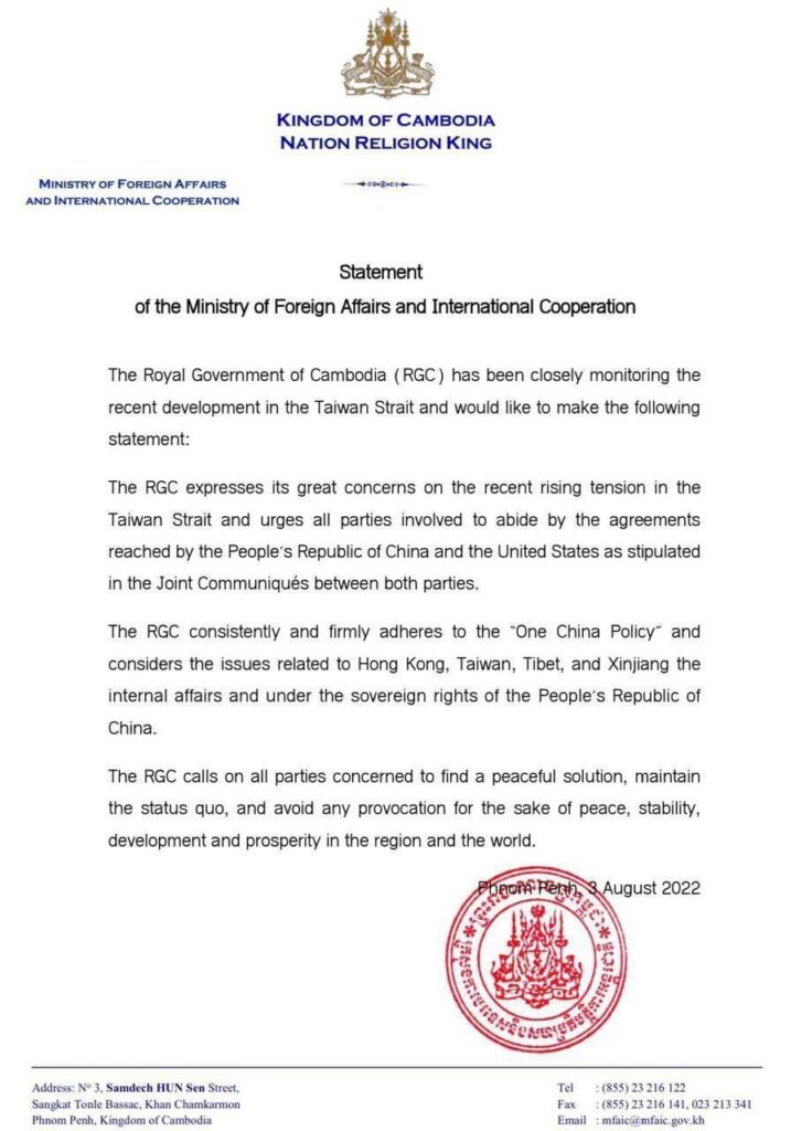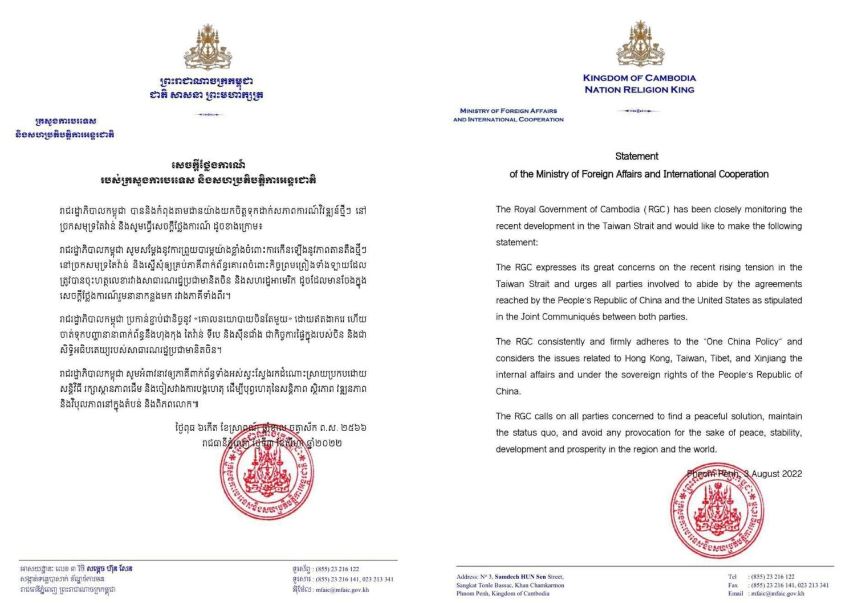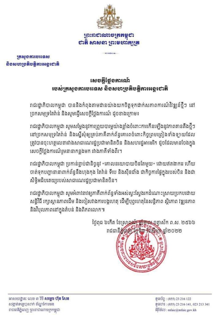 រាជរដ្ឋាភិបាលកម្ពុជា សូមសម្តែងនូវការព្រួយបារម្ភយ៉ាងខ្លាំងចំពោះការកើនឡើងនូវភាពតានតឹងថ្មីៗ នៅច្រកសមុទ្រតៃវ៉ាន់ និងស្នើសុំឲ្យគ្រប់ភាគីពាក់ព័ន្ធគោរពចំពោះកិច្ចព្រមព្រៀងទាំងឡាយដែល ត្រូវបានចុះហត្ថលេខារវាងសាធារណរដ្ឋប្រជាមានិតចិន និងសហរដ្ឋអាមេរិក ដូចដែលមានចែងក្នុង សេចក្ដីថ្លែងការណ៍រួមនានាកន្លងមក រវាងភាគីទាំងពីរ។