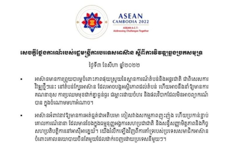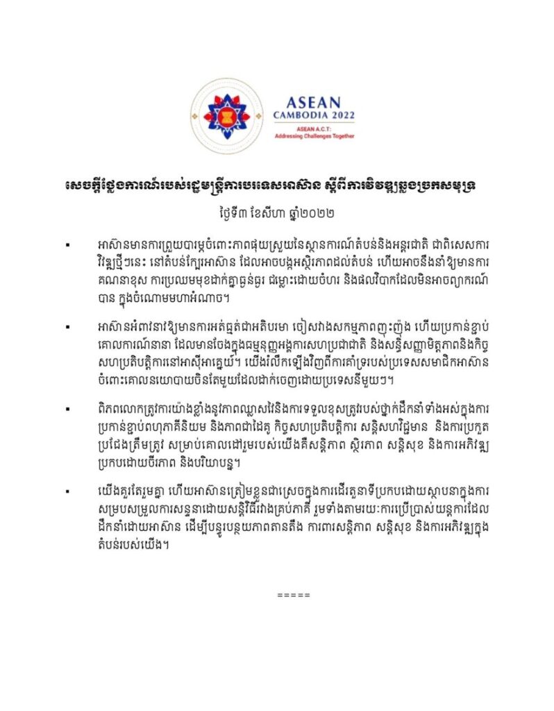 ភ្នំពេញ៖ រដ្ឋមន្ត្រីការបរទេសអាស៊ាន បានចេញសេចក្តីថ្លែងការណ៍ ស្តីពីការវិវឌ្ឍឆ្លងច្រកសមុទ្រ នៅថ្ងៃទី៣ ខែសីហា ឆ្នាំ២០២២ ។ នៅក្នុងសេចក្តីថ្លែងការណ៍របស់រដ្ឋមន្ត្រីការបរទេសអាស៊ាន បានបញ្ជាក់ថា អាស៊ាន មានការព្រួយបារម្ភចំពោះភាពផុយស្រួយនៃស្ថានការណ៍តំបន់និងអន្តរជាតិ ជាពិសេសការវិវឌ្ឍថ្មីៗនេះ នៅតំបន់ក្បែរអាស៊ាន ដែល អាច បង្កអស្ថិរភាពដល់តំបន់ ហើយអាចនឹងនាំឱ្យមានការគណនាខុស ការប្រឈមមុខដាក់គ្នាធ្ងន់ធ្ងរ ជម្លោះដោយចំហរ និងផលវិបាកដែលមិនអាចព្យាករណ៍បាន ក្នុងចំណោមមហាអំណាច។