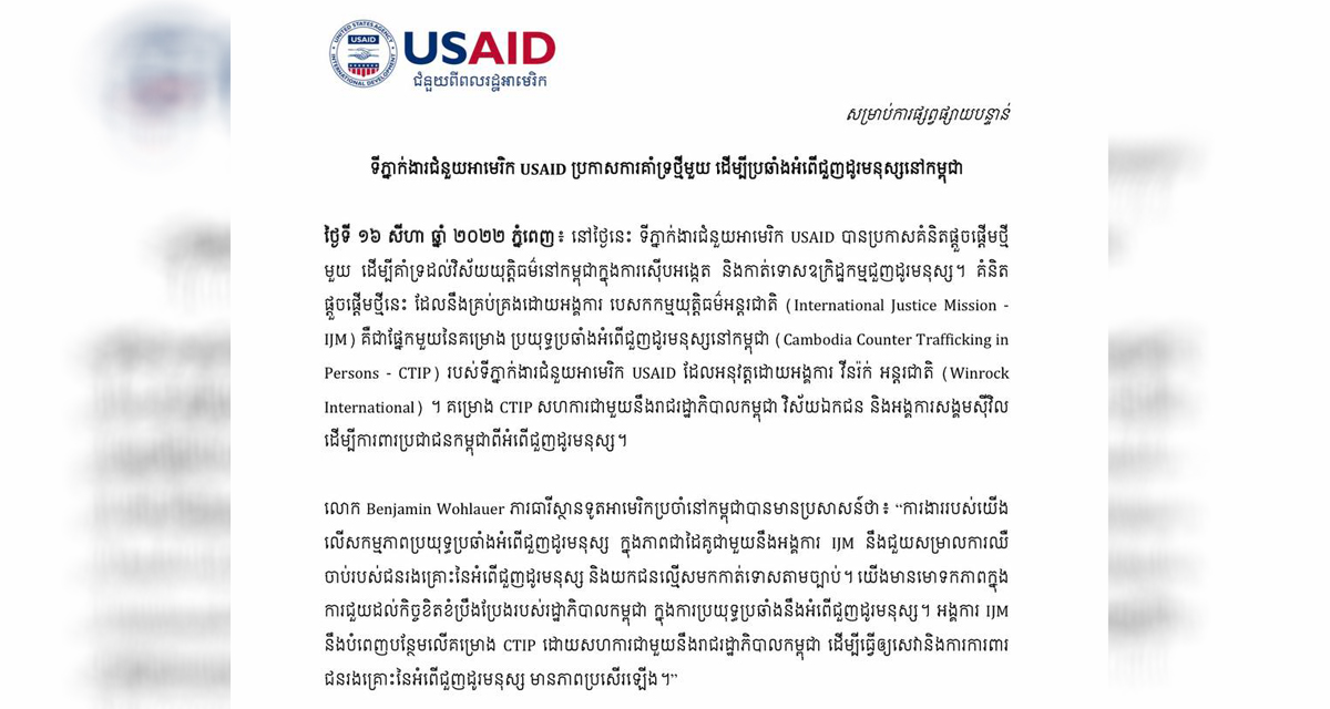 ភ្នំពេញ៖ ទីភ្នាក់ងារជំនួយអាមេរិក USAID បានប្រកាសគំនិតផ្តួចផ្តើមថ្មីមួយ ដើម្បីគាំទ្រដល់វិស័យយុត្តិធម៌នៅកម្ពុជាក្នុងការស៊ើបអង្កេត និងកាត់ទោសឧក្រិដ្ឋកម្មជួញដូរមនុស្ស។ គំនិតផ្តួចផ្តើមថ្មីនេះ ដែលនឹងគ្រប់គ្រងដោយអង្គការបេសកកម្មយុត្តិធម៌អន្តរជាតិ (International Justice Mission – IJM) គឺជាផ្នែកមួយនៃគម្រោងប្រយុទ្ធប្រឆាំងអំពើជួញដូរមនុស្សនៅកម្ពុជា (Cambodia Counter Trafficking in Persons – CTIP) របស់ទីភ្នាក់ងារជំនួយអាមេរិក USAID ដែលអនុវត្តដោយអង្គការ វីនរ៉ក់ អន្តរជាតិ (Winrock International)។ គម្រោង CTIP សហការជាមួយនឹងរាជរដ្ឋាភិបាលកម្ពុជា វិស័យឯកជន និងអង្គការសង្គមស៊ីវិល ដើម្បីការពារប្រជាជនកម្ពុជាពីអំពើជួញដូរមនុស្ស។ នេះបើយោងតាមសេចក្តីប្រកាសព័ត៌មានរបស់ទីភ្នាក់ងារជំនួយអាមេរិក USAID នៅថ្ងៃទី១៦ ខែសីហា ឆ្នាំ២០២២។