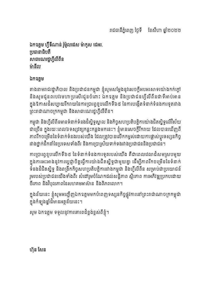 សម្តេចតេជោ ហ៊ុន សែន ផ្ញើសារជូនប្រធានាធិបតីហ្វីលីពីន អបអរសាទរ និងជូនពរក្នុងខួបលើកទី៦៥ នៃការបង្កើតទំនាក់ទំនងការទូតប្រទេសទាំងពីរOne-Minuteអត្ថបទដោយ៖AMS OneMinute AMS OneMinuteអត្ថបទមុនអត្ថបទបន្ទាប់