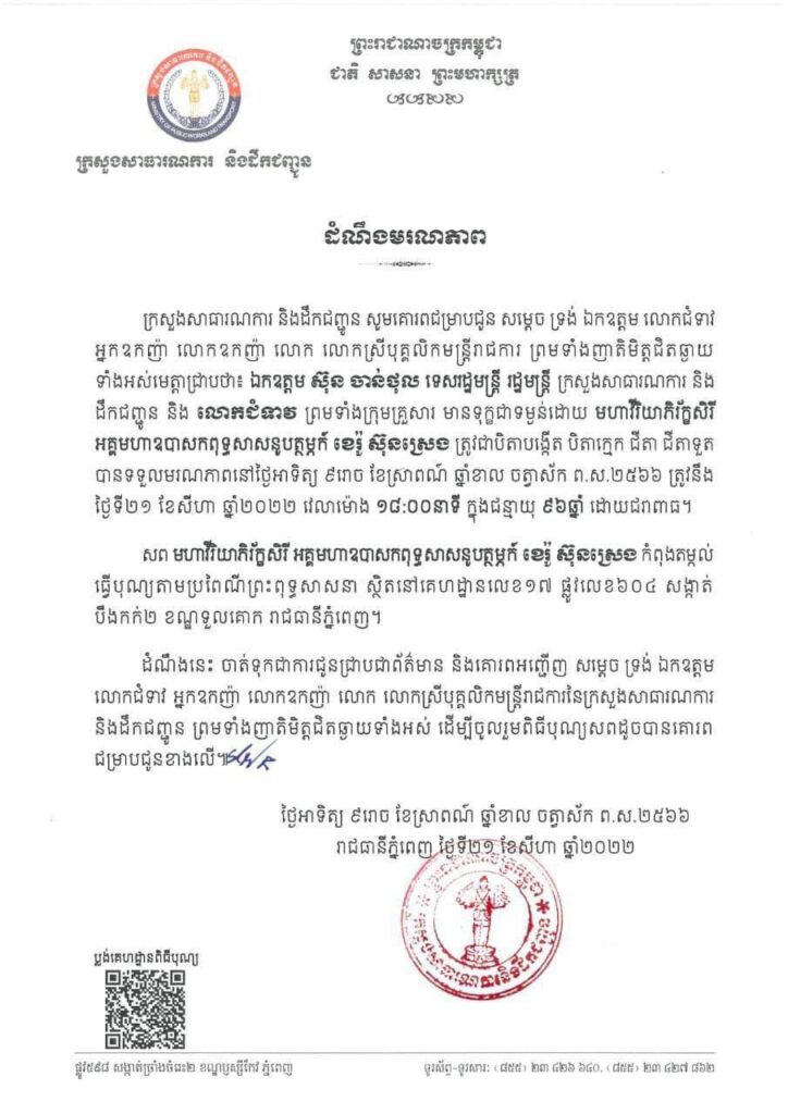 ដំណឹងពីមរណភាពឪពុកបង្កើតរបស់ទេសរដ្ឋមន្ត្រី ស៊ុន ចាន់ថុលOne-Minuteអត្ថបទដោយ៖AMS OneMinute AMS OneMinuteអត្ថបទមុនអត្ថបទបន្ទាប់