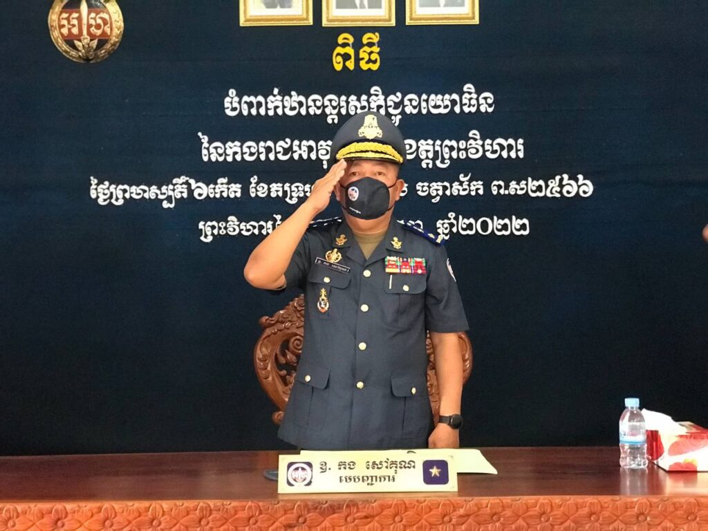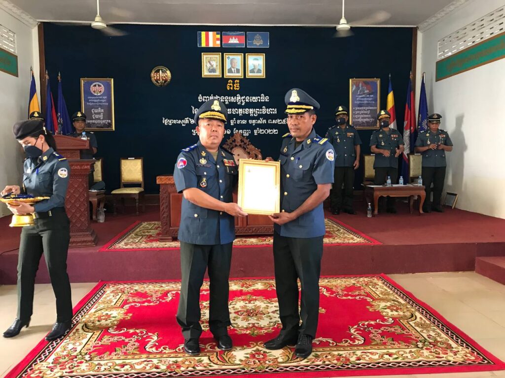 ខេត្តព្រះវិហារ ៖ យោធិន នៃកងរាជអាវុធហត្ថខេត្តព្រះវិហារ ១៥រូប ដែលមានស្នាដៃក្នុងការស្ថាបនាជាតិ និងការថែរក្សាសន្តិសុខ សុវត្ថិភាព និងសណ្តាប់ធ្នាប់សាធារណៈ ជូនប្រជាពលរដ្ឋក្នុងមូលដ្ឋាន ទទួលបានការលើកទឹកចិត្ត និងតម្លើងឋានន្តរស័ក្តិ ពីថ្នាក់ដឹកនាំកងរាជអាវុធហត្ថថ្នាក់ជាតិ និងមេបញ្ជាការកងរាជអាវុធហត្ថខេត្តព្រះវិហារ លោកឧត្តមសេនីយ៍ត្រី កង សៅគុណ កាលពីរសៀលថ្ងៃទី១ ខែកញ្ញា ឆ្នាំ២០២២ នៅបញ្ជាការដ្ឋានកងរាជអាវុធហត្ថខេត្តព្រះវិហារ ។