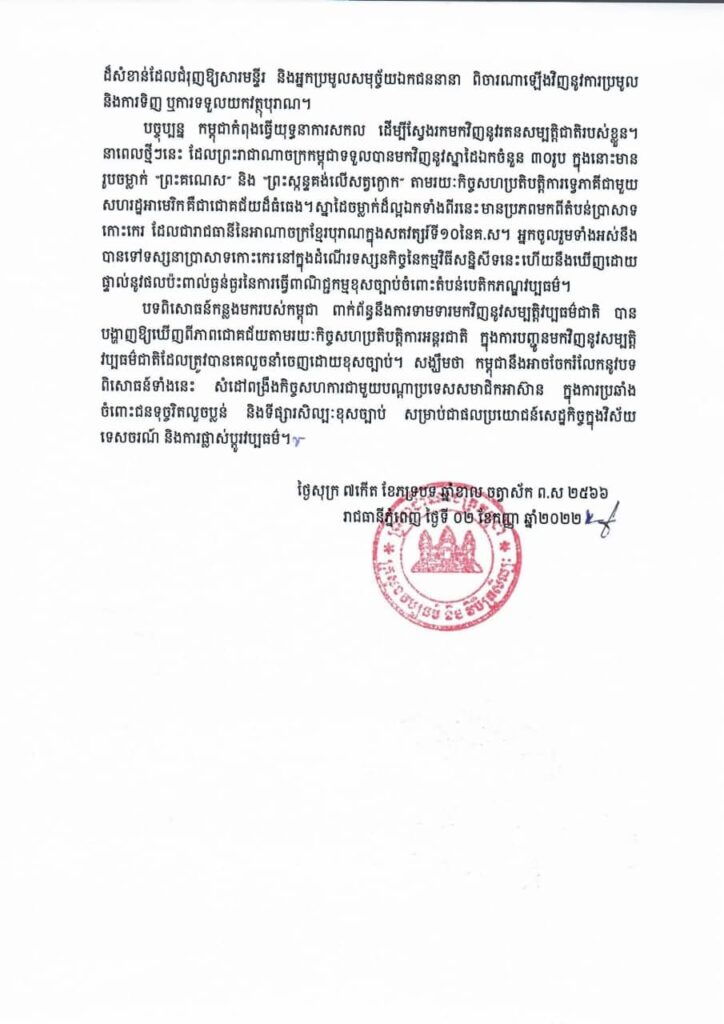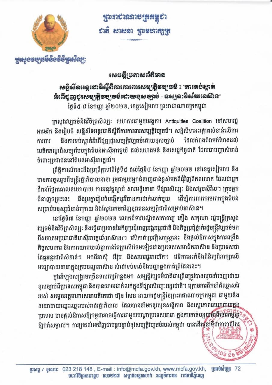 សេចក្តីប្រកាសព័ត៌មាន សន្និសីទអន្តរជាតិស្តីពីការការពារសម្បត្តិវប្បធម៌៖ ការទប់ស្កាត់អំពើជួញដូរសម្បត្តិវប្បធម៌ដោយខុសច្បាប់ – ទស្សនៈវិស័យអាស៊ាន”One-Minuteអត្ថបទដោយ៖AMS OneMinute AMS OneMinuteអត្ថបទមុនអត្ថបទបន្ទាប់
