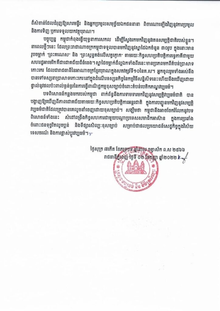 ក្រសួងវប្បធម៌ អះអាងថា បទពិសោធន៍កន្លងមករបស់កម្ពុជា ពាក់ព័ន្ធនឹងការទាមទារមកវិញនូវសម្បត្តិវប្បធម៌ជាតិ បានបង្ហាញឱ្យឃើញពីភាពជោគជ័យតាមរយៈកិច្ចសហប្រតិបត្តិការអន្តរជាតិ ក្នុងការបញ្ជូនមកវិញនូវសម្បត្តិវប្បធម៌ជាតិដែលត្រូវបានគេលួចនាំចេញដោយខុសច្បាប់។ ក្រសួងសង្ឃឹមថា កម្ពុជានឹងអាចចែករំលែកនូវបទពិសោធន៍ទាំងនេះ សំដៅពង្រឹងកិច្ចសហការជាមួយបណ្តាប្រទេសសមាជិកអាស៊ាន ក្នុងការប្រឆាំងចំពោះជនទុច្ចរិតលួចប្លន់ និងទីផ្សារសិល្បៈខុសច្បាប់ សម្រាប់ជាផលប្រយោជន៍សេដ្ឋកិច្ចក្នុងវិស័យទេសចរណ៍ និងការផ្លាស់ប្តូរវប្បធម៌៕ សេឌី