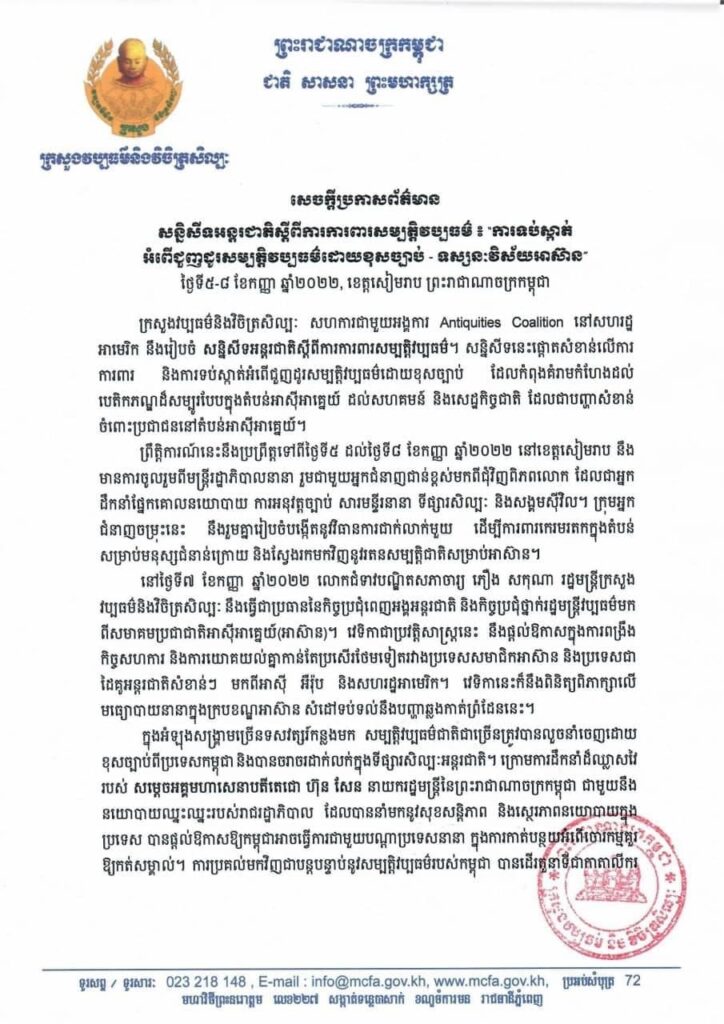 ភ្នំពេញ៖ ក្រសួងវប្បធម៌ និងវិចិត្រសិល្បៈ សហការជាមួយអង្គការ Antiquities Coalition នៅសហរដ្ឋអាមេរិក នឹងរៀបចំសន្និសីទអន្តរជាតិ ស្តីពីការការពារសម្បត្តិវប្បធម៌។ សន្និសីទនេះ ផ្តោតសំខាន់លើការការពារ និងការទប់ស្កាត់អំពើជួញដូរសម្បត្តិវប្បធម៌ដោយខុសច្បាប់ ដែលកំពុងគំរាមកំហែងដល់បេតិកភណ្ឌដ៏សម្បូរបែប ក្នុងតំបន់អាស៊ីអាគ្នេយ៍ ដល់សហគមន៍ និងសេដ្ឋកិច្ចជាតិ ដែលជាបញ្ហាសំខាន់ ចំពោះប្រជាជននៅតំបន់អាស៊ីអាគ្នេយ៍។