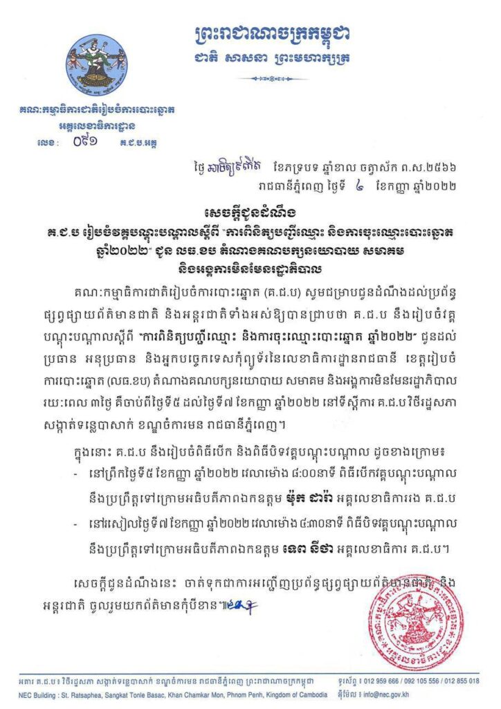 ភ្នំពេញ:គណៈកម្មាធិការជាតិរៀបចំការបោះឆ្នោត (គ.ជ.ប) នឹងរៀបចំវគ្គបណ្ដុះបណ្ដាលស្ដីពី «ការពិនិត្យបញ្ជីឈ្មោះ និងការចុះឈ្មោះបោះឆ្នោត ឆ្នាំ២០២២» ជូនដល់ប្រធាន អនុប្រធាន និងអ្នកបច្ចេកទេសកុំព្យូទ័រ នៃលេខាធិការដ្ឋានរាជធានី ខេត្តរៀបចំការបោះឆ្នោត (លធ.ខប) តំណាងគណបក្សនយោបាយ សមាគម និងអង្គការមិនមែនរដ្ឋាភិបាល រយៈពេល ៣ថ្ងៃ។ វគ្គបណ្ដុះបណ្ដាល នឹងធ្វើឡើងចាប់ពីថ្ងៃទី៥ ដល់ថ្ងៃទី៧ ខែកញ្ញា ឆ្នាំ២០២២ នៅទីស្ដីការ គ.ជ.ប វិថីរដ្ឋសភា សង្កាត់ទន្លេបាសាក់ ខណ្ឌចំការមន រាជធានីភ្នំពេញ។