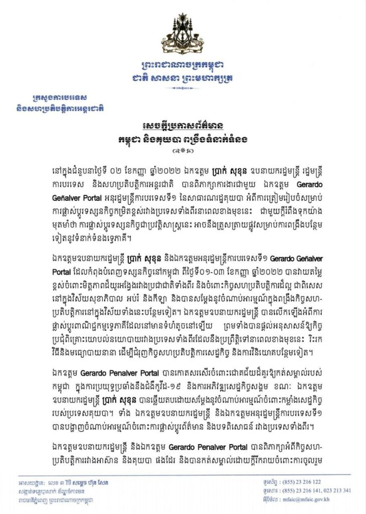 ឯកឧត្តមឧបនាយករដ្ឋមន្រ្តី ប្រាក់ សុខុន និងឯកឧត្តមអនុរដ្ឋមន្រ្តីការបរទេសទី១ Gerardo Geñalver Portal ដែលកំពុងបំពេញទស្សនកិច្ចនៅកម្ពុជា ពីថ្ងៃទី០១-០៣ ខែកញ្ញា ឆ្នាំ២០២២ បានវាយតម្លៃខ្ពស់ចំពោះមិត្តភាពដ៏យូរអង្វែងរវាងប្រជាជាតិទាំងពីរ និងចំពោះកិច្ចសហប្រតិបត្តិការដ៏ល្អ ជាពិសេស នៅក្នុងវិស័យសុខាភិបាល អប់រំ និងកីឡា និងបានសម្តែងនូវចំណាប់អារម្មណ៍ក្នុងពង្រឹងកិច្ចសហ-ប្រតិបត្តិការនៅក្នុងវិស័យទាំងនេះបន្ថែមទៀត។