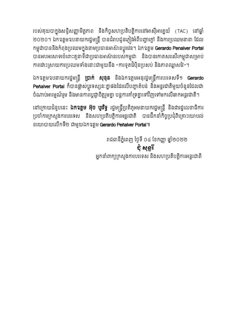 ឯកឧត្ដមឧបនាយករដ្ឋមន្ត្រី ប្រាក់ សុខុន និងឯកឧត្ដមអនុរដ្ឋមន្ត្រីការបរទេសទី១ Gerardo Peñalver Portal ក៏បានផ្លាស់ប្តូរទស្សនៈគ្នាផងដែរលើបញ្ហាតំបន់ និងអន្តរជាតិមួយចំនួនដែលជាចំណាប់អារម្មណ៍រួម និងមាន ការប្តេជ្ញាចិត្តរួមគ្នា បន្តការគាំទ្រគ្នាទៅវិញទៅមកលើឆាកអន្តរជាតិ។