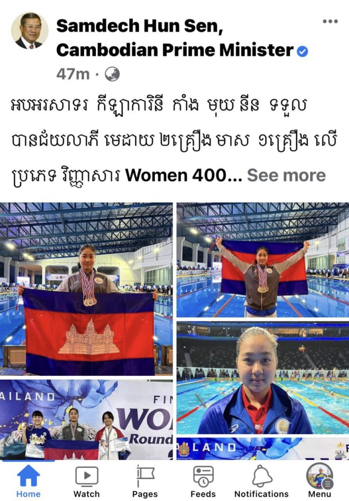 សម្តេចតេជោ បានបង្ហោះអបអរកីឡាការិនី កាំង មុយនីន ទទួលបានជ័យលាភី មេដាយ២គ្រឿង