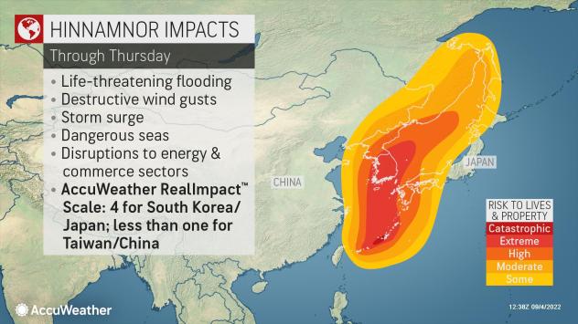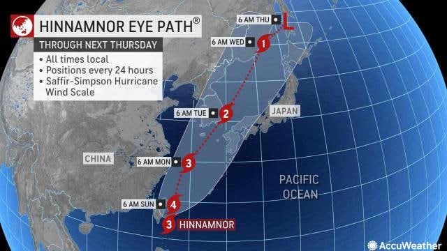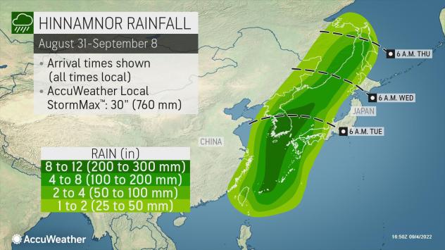 សេចក្ដីណែនាំពីអាកាសធាតុថា ព្យុះ Hinnamnor នឹងបក់បោកឆ្ពោះទៅកាន់ភាគខាងជើង ក្នុងល្បឿនខ្យល់ ១៩គីឡូម៉ែត្រក្នុងមួយម៉ោង ហើយអាចនឹងឡើងដល់៩០គីឡូម៉ែត្រក្នុងមួយម៉ោង ឆ្ពោះទៅកាន់ភាគនិរតីនៃទីក្រុងកំពង់ផែប៊ូសាន នៅព្រឹកថ្ងៃអង្គារ ខណៈព្យុះនេះនឹងបក់បោកដល់តំបន់ដែនទឹក នៃកោះ Jeju នៅពាក់កណ្ដាលយប់ថ្ងៃចន្ទ។